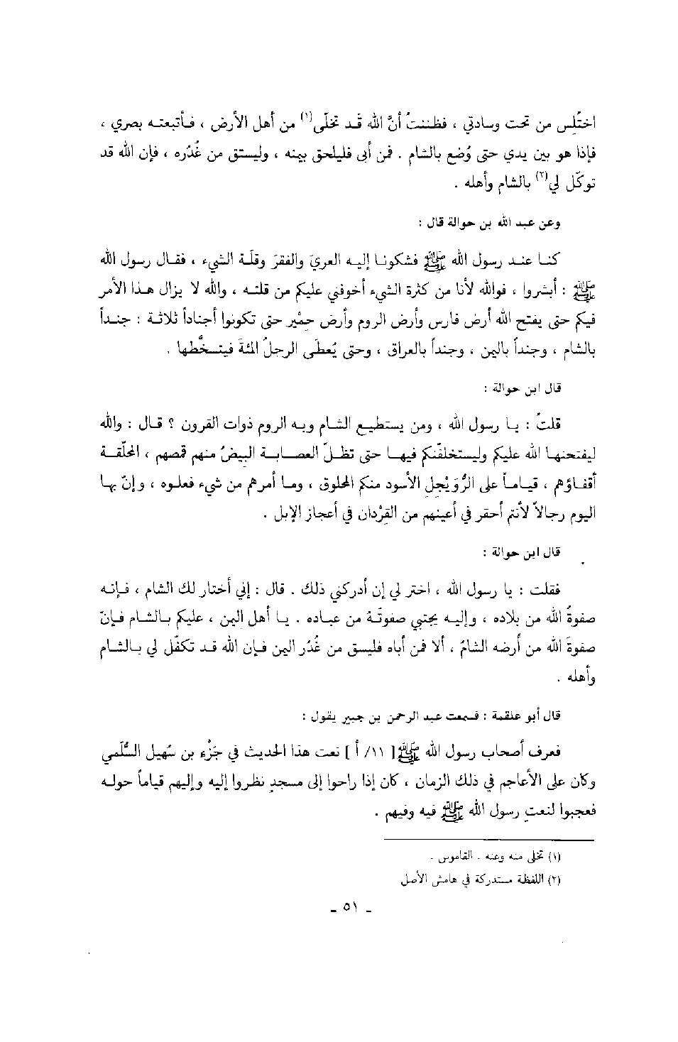 قال ابن حوالة: قلت: يا رسول الله، ومن يستطيع الشام وبه الروم ذوات القرون؟ قال: " والله ليفتحنها الله عليكم وليستخلفنكم فيها حتى تظل العصابة البيض منهم قمصهم، المحلقة أقفاؤهم، قياماً على الرويجل الأسود منكم المحلوق، وما أمرهم من شيء فعلوه، وإن بها اليوم رجالاً لأنتم أحقر في أعينهم من القردان في أعجاز الإبل ".