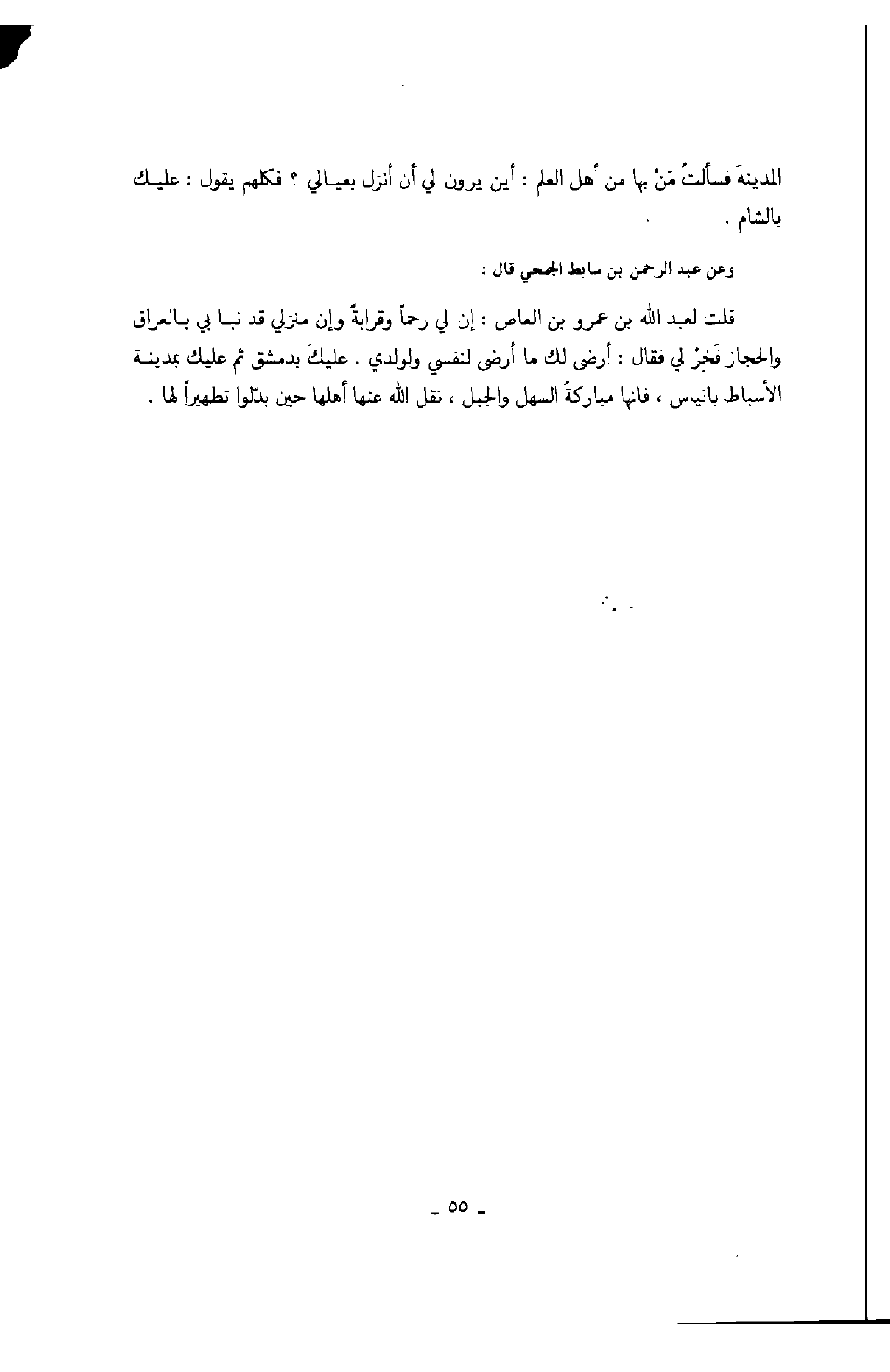 وعن عبد الرحمن بن سابط الجمحي قال: قلت لعبد الله بن عمرو بن العاص: إن لي رحماً وقرابة وإن منزلي قد نبا بي بالعراق والحجاز فخر لي فقال: أرضى لك ما أرضى لنفسي ولولدي. عليك بدمشق ثم عليك بمدينة الأسباط بانياس، فإنها مباركة السهل والجبل، نقل الله عنها أهلها حين بدلوا تطهيراً لها.