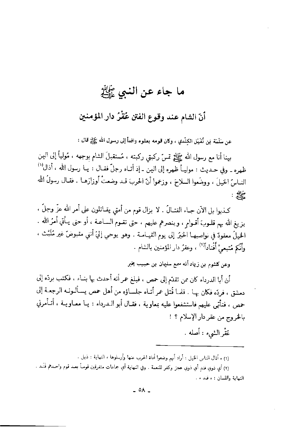 عن سلمة بن نفيل الكندي، وكان قومه بعثوه وافداً إلى رسول الله صَلَّى اللهُ عَلَيْهِ وَسَلَّمَ قال: بينا أنا مع رسول الله صَلَّى اللهُ عَلَيْهِ وَسَلَّمَ تمس ركبتي ركبته، مستقبل الشام بوجهه، مولياً إلى اليمن ظهره وفي حديث: مولياً ظهره إلى اليمن إذ أتاه رجل فقال: يا رسول الله، أذال الناس الخيل، ووضعوا السلاح، وزعموا أن الحرب قد وضعت أوزارها. فقال رسول الله صَلَّى اللهُ عَلَيْهِ وَسَلَّمَ: " كذبوا بل الآن جاء القتال. لا يزال قوم من أمتي يقاتلون على أمر الله عز وجل، يزيغ الله قلوب أقوام، وينصرهم عليهم، حتى تقوم الساعة، أو حتى يأتي أمر الله. الخيل معقود في نواصيها الخير إلى يوم القيامة. وهو يوحي إلي أنني مقبوض غير ملبث، وأنكم متبعي أفناداً، وعقر دار المؤمنين بالشام ".