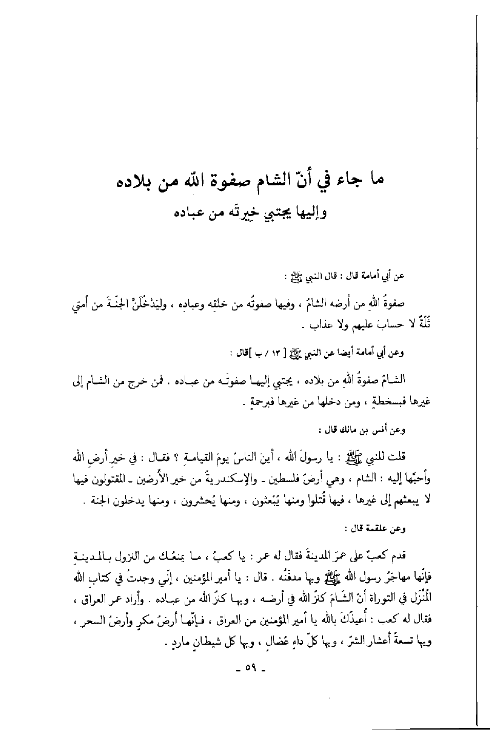 عن أبي أمامة قال: قال النبي صَلَّى اللهُ عَلَيْهِ وَسَلَّمَ: صفوة الله من أرضه الشام، وفيها صفوته من خلقه وعباده، وليدخلن الجنة من أمتي ثلة لا حساب عليهم ولا عذاب.