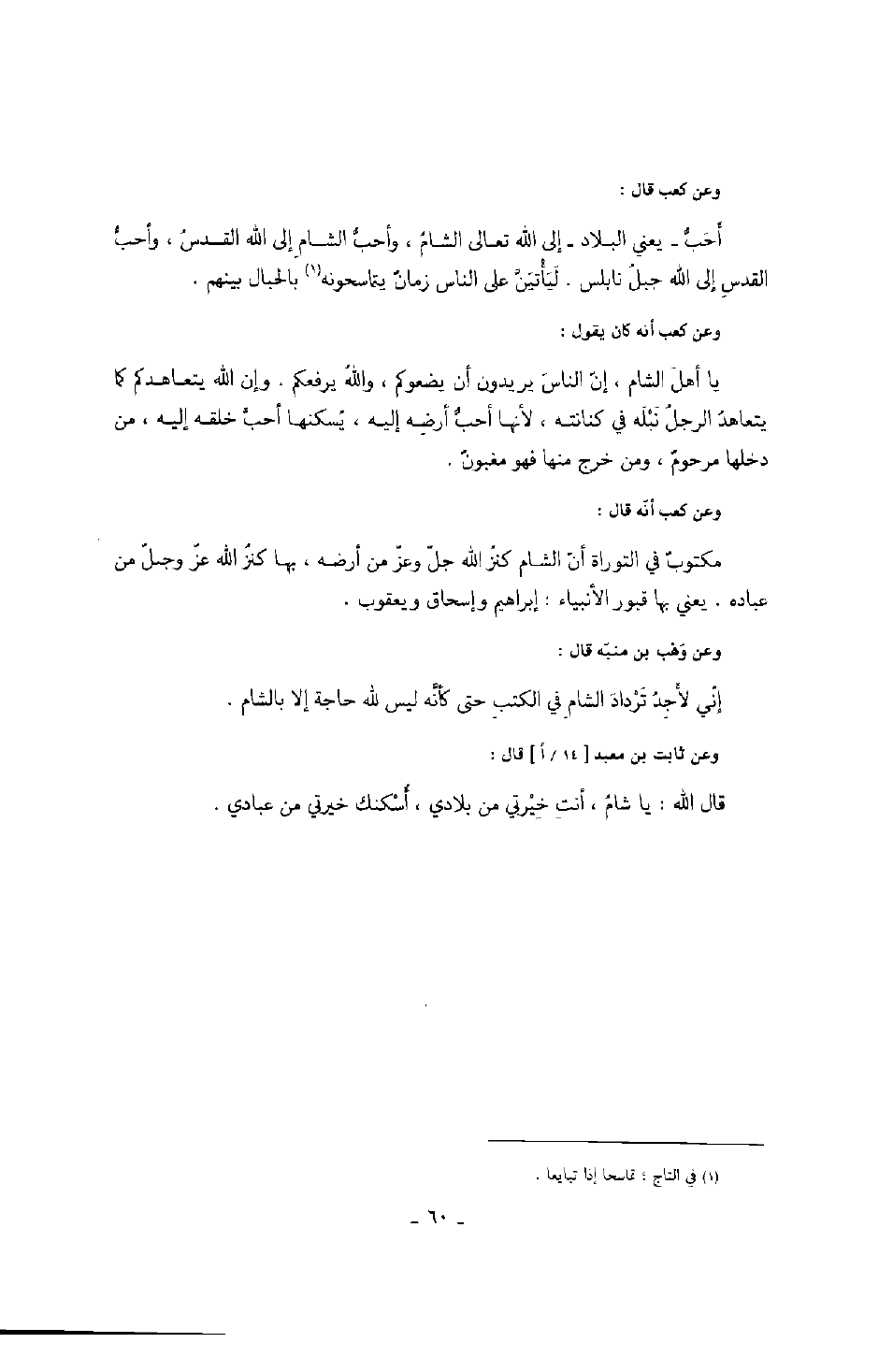 وعن كعب قال: أحب يعني البلاد إلى الله تعالى الشام، وأحب الشام إلى الله القدس، وأحب القدس إلى الله جبل نابلس. ليأتين على الناس زمان يتماسحونه بالحبال بينهم.