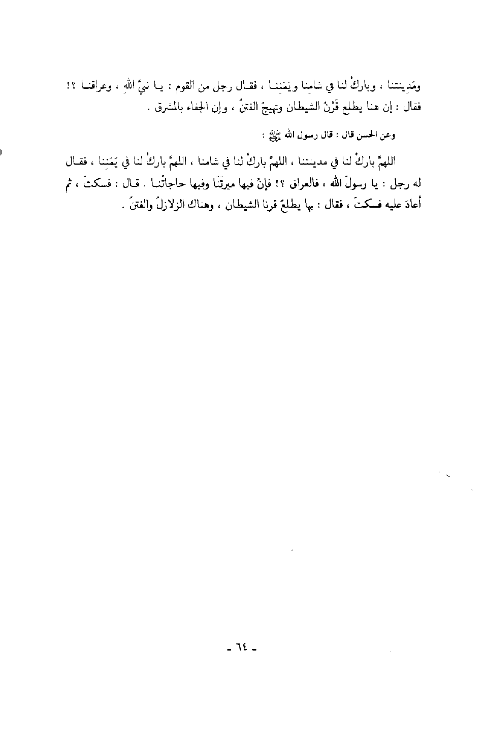 وعن الحسن قال: قال رسول الله صَلَّى اللهُ عَلَيْهِ وَسَلَّمَ: " اللهم بارك لنا في مدينتنا، اللهم بارك لنا في شامنا، اللهم بارك لنا في يمننا "، فقال له رجل: يا رسول الله، فالعراق؟! فإن فيها ميراتنا وفيها حاجاتنا. قال: فسكت، ثم أعاد عليه فسكت، فقال: " بها يطلع قرنا الشيطان، وهناك الزلازل والفتن ".
