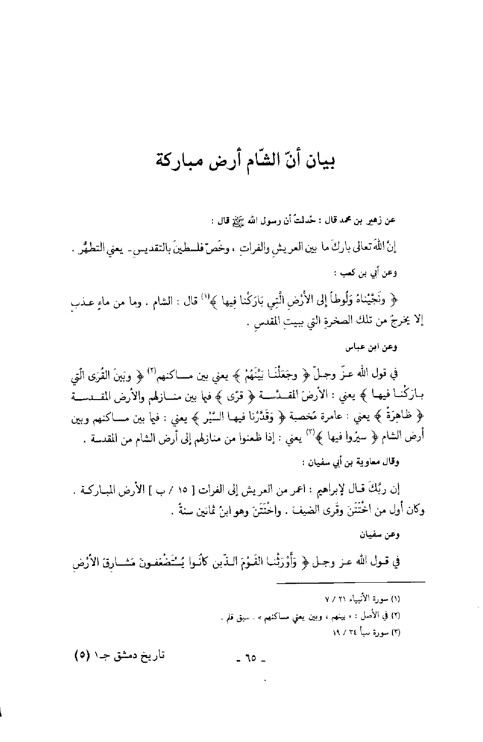 عن زهير بن محمد قال: حدثت أن رسول الله صَلَّى اللهُ عَلَيْهِ وَسَلَّمَ قال: " إن الله تعالى بارك ما بين العريش والفرات، وخص فلسطين بالتقديس " يعني التطهير.