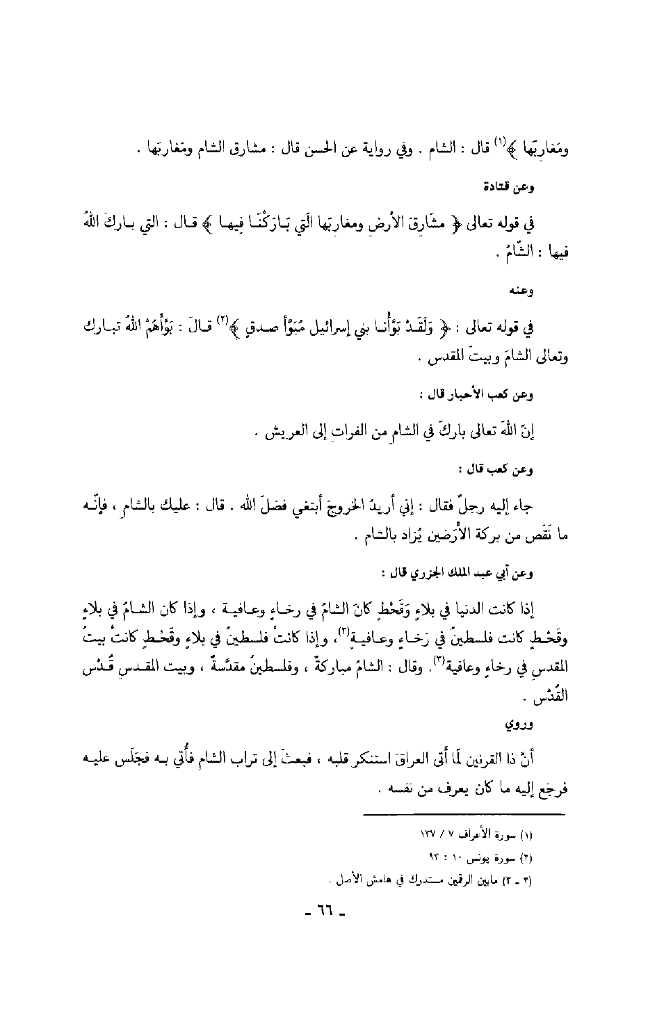وعن قتادة في قوله تعالى " مشارق الأرض ومغاربها التي باركنا فيها " قال: التي بارك الله فيها: الشام.