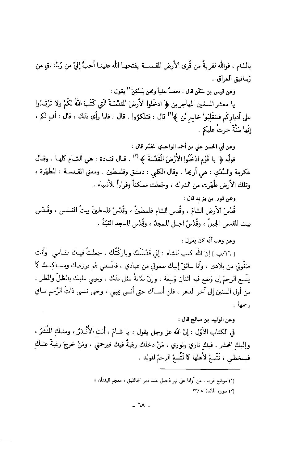 وعن ثور بن يزيد قال: قدس الأرض الشام، وقدس الشام فلسطين، وقدس فلسطين بيت المقدس، وقدس بيت المقدس الجبل، وقدس الجبل المسجد، وقدس المسجد القبة.