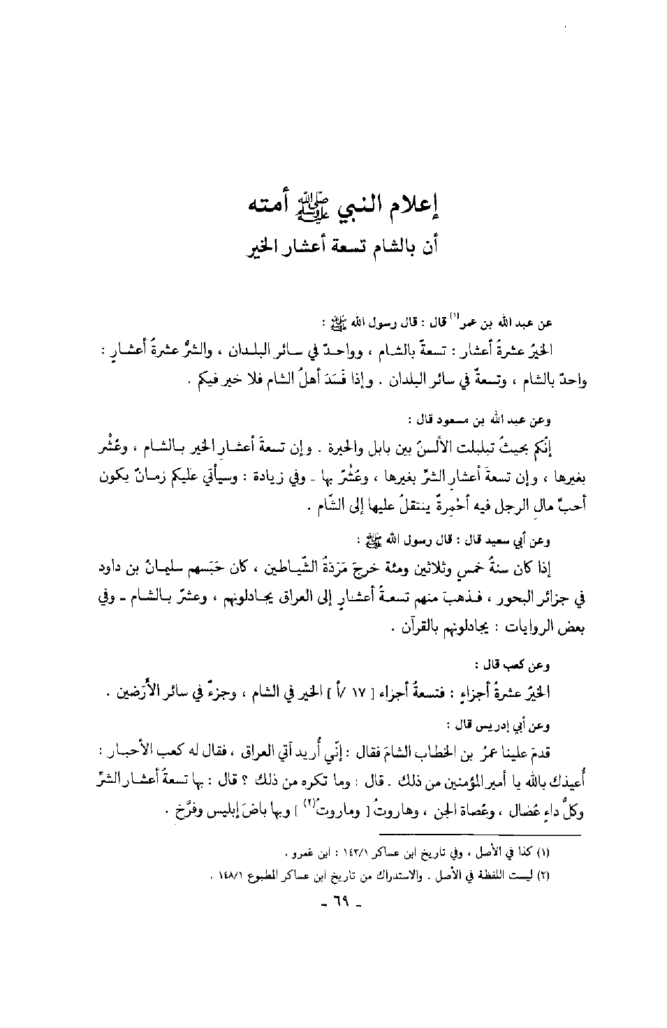 عن عبد الله بن عمر قال: قال رسول الله صَلَّى اللهُ عَلَيْهِ وَسَلَّمَ: " الخير عشرة أعشار: تسعة بالشام، وواحد في سائر البلدان، والشر عشرة أعشار: واحد بالشام، وتسعة في سائر البلدان. وإذا فسد أهل الشام فلا خير فيكم ".