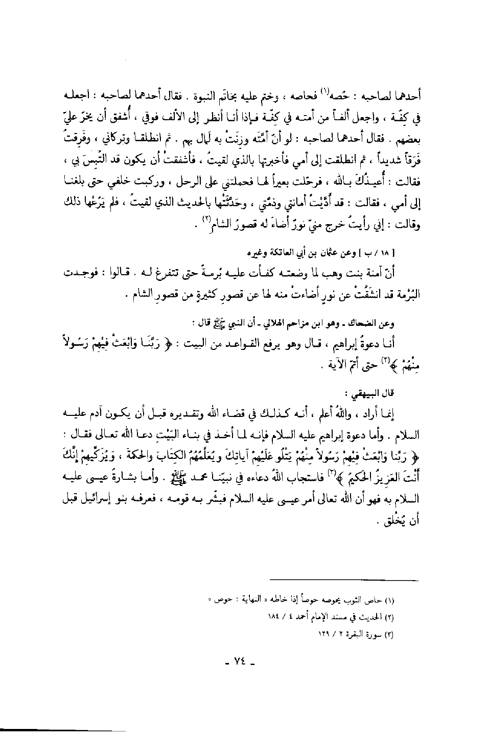 أحدهما لصاحبه: حصه فحاصه، وختم عليه بخاتم النبوة. فقال أحدهما لصاحبه: اجعله في كفة، واجعل ألفاً من أمته في كفة فإذا أنا أنظر إلى الألف فوقي، أشفق أن يخر علي بعضهم. فقال أحدهما لصاحبه: لو أن أمته وزنت به لمال بهم. ثم انطلقا وتركاني، وفرقت فرقاً شديداً، ثم انطلقت إلى أمي فأخبرتها بالذي لقيت، فأشفقت أن يكون قد التبس بي، فقالت: أعيذك بالله، فرحلت بعيراً لها فحملتني على الرحل، وركبت خلفي حتى بلغنا إلى أمي، فقالت: قد أديت أمانتي وذمتي، وحدثتها بالحديث الذي لقيت، فلم يرعها ذلك وقالت: إني رأيت خرج مني نور أضاء له قصور الشام ".