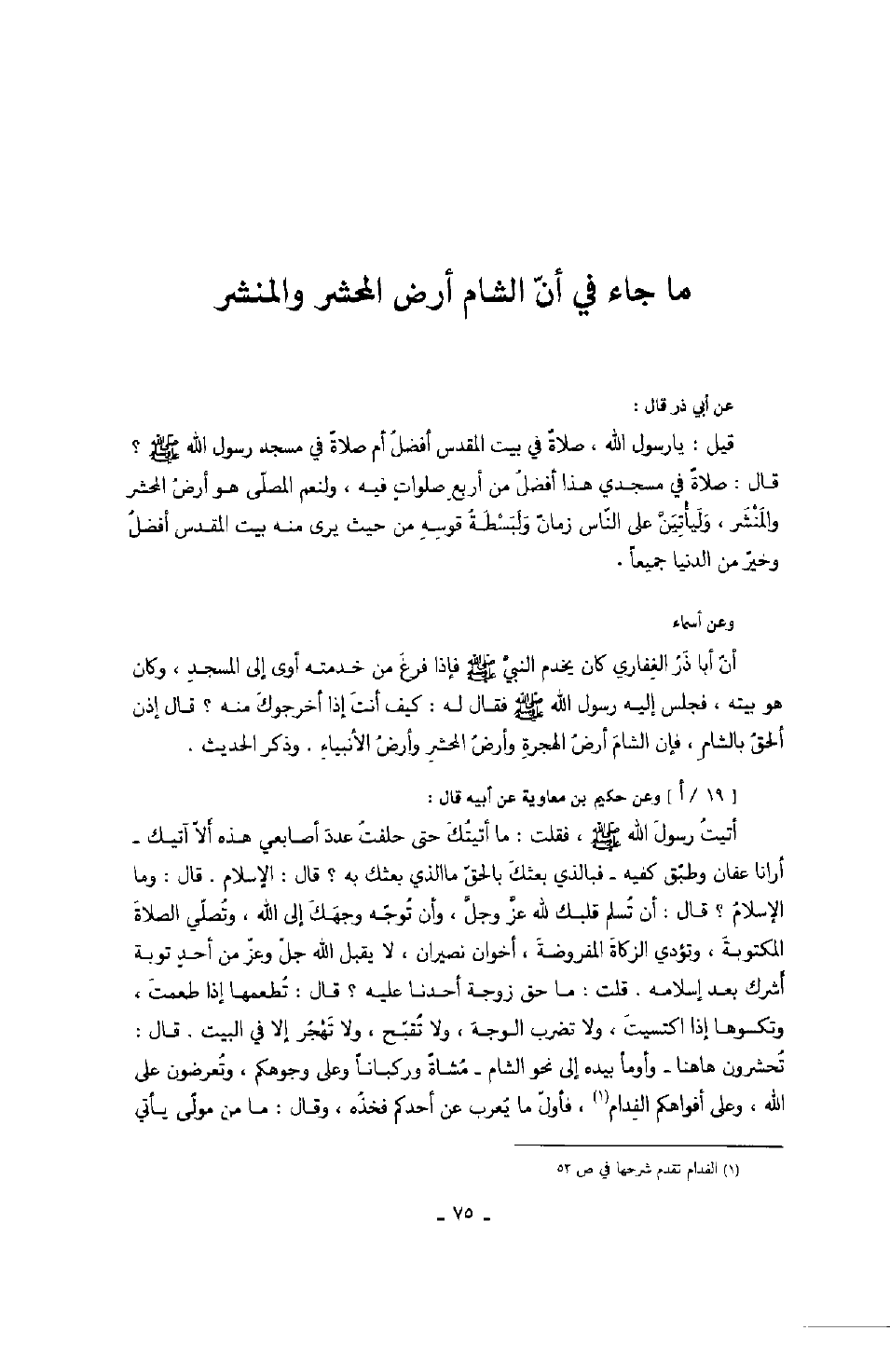 عن أبي ذر قال: قيل: يا رسول الله، صلاة في بيت المقدس أفضل أم صلاة في مسجد رسول الله صَلَّى اللهُ عَلَيْهِ وَسَلَّمَ؟ قال: " صلاة في مسجدي هذا أفضل من أربع صلوات فيه، ولنعم المصلى هو أرض المحشر والمنشر، وليأتين على الناس زمان ولبسطة قوسه من حيث يرى منه بيت المقدس أفضل وخير من الدنيا جميعاً ".