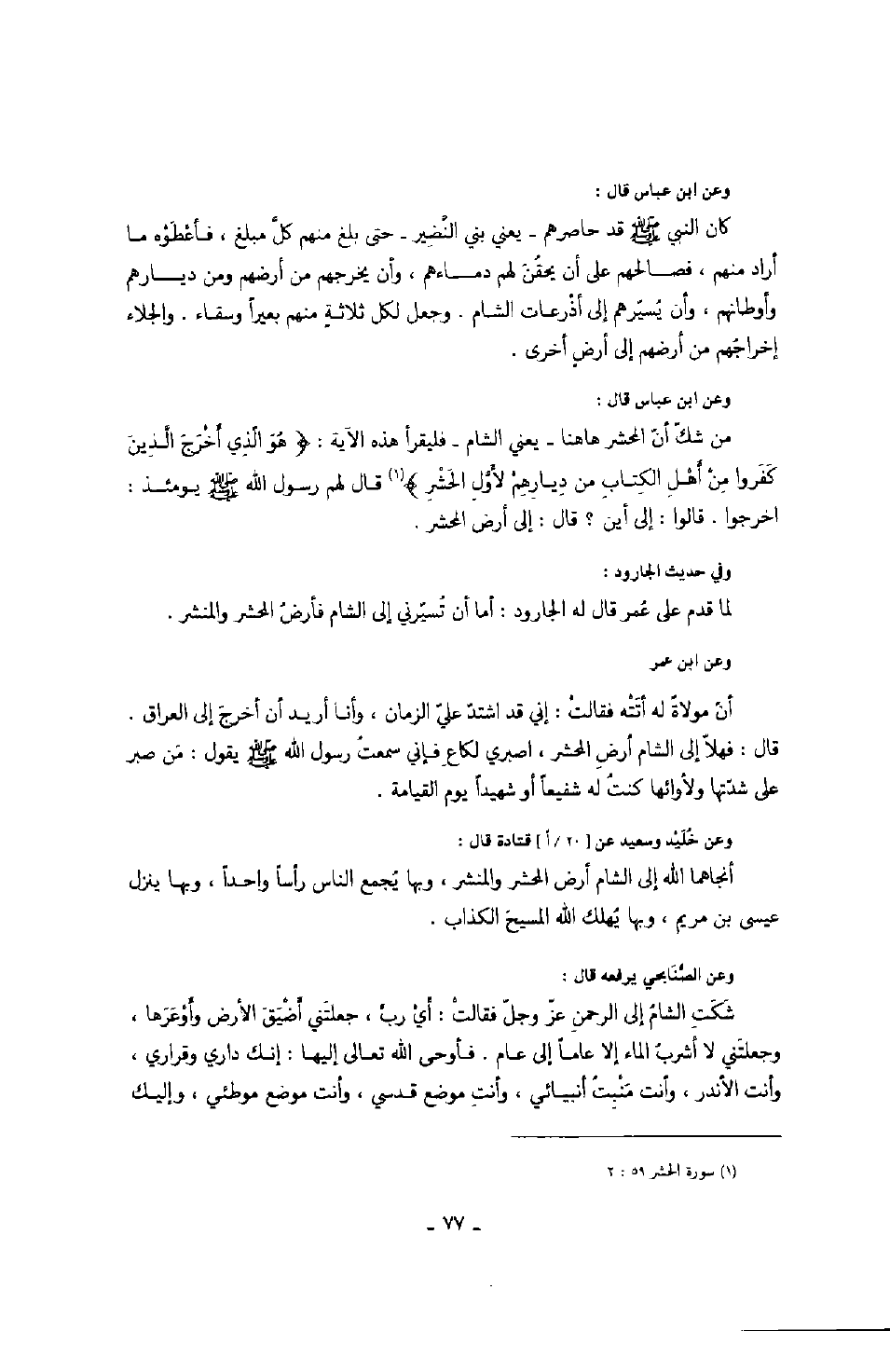 وعن ابن عباس قال: من شك أن المحشر هاهنا يعني الشام فليقرأ هذه الآية: " هو الذي أخرج الذين كفروا من أهل الكتاب من ديارهم لأول الحشر " قال لهم رسول الله صَلَّى اللهُ عَلَيْهِ وَسَلَّمَ يومئذ: " اخرجوا. قالوا: إلى أين؟ قال: إلى أرض المحشر ".