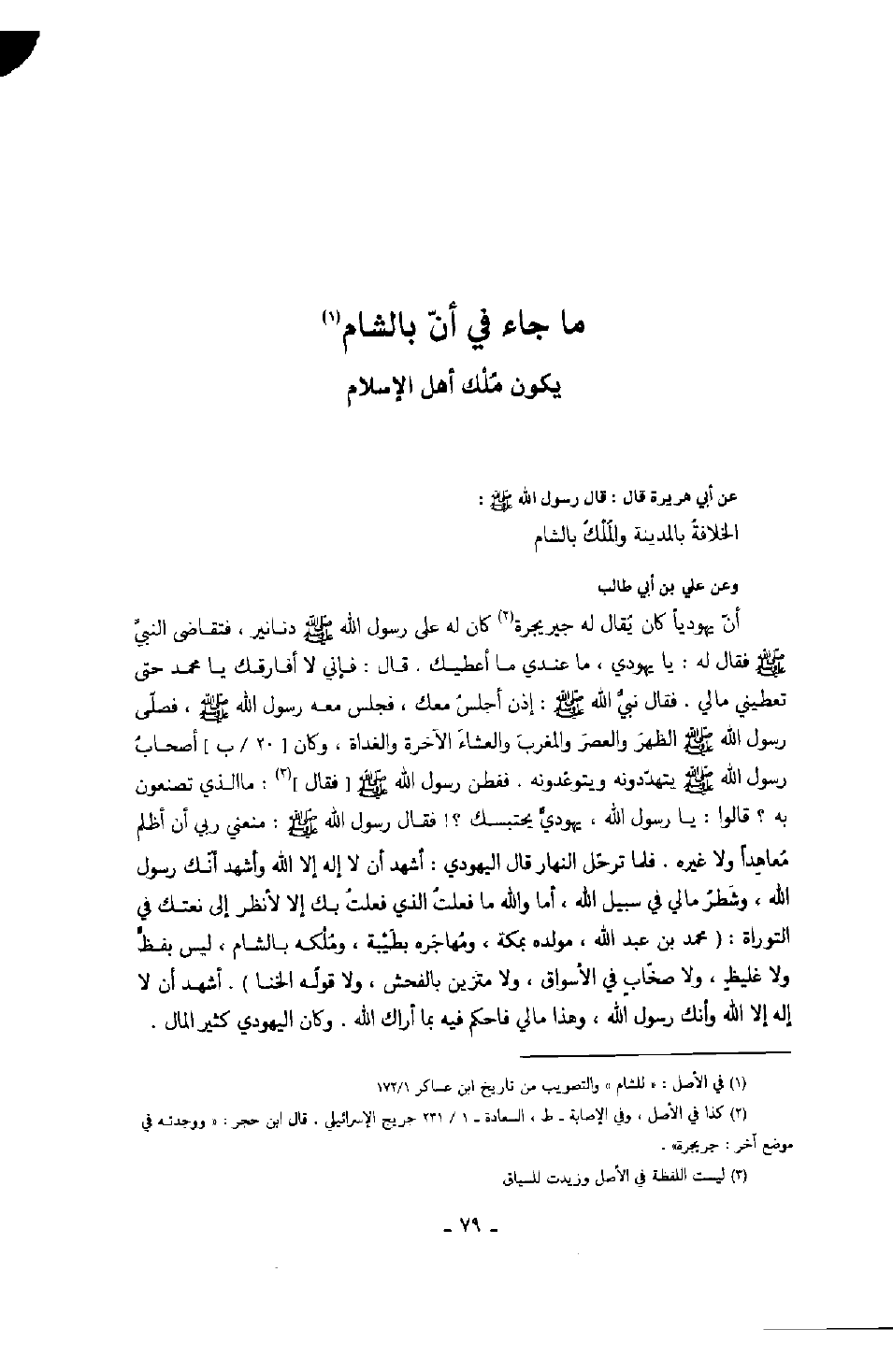 عن أبي هريرة قال: قال رسول الله صَلَّى اللهُ عَلَيْهِ وَسَلَّمَ: " الخلافة بالمدينة والملك بالشام ".