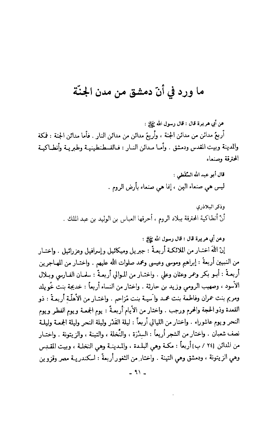 عن أبي هريرة قال: قال رسول الله صَلَّى اللهُ عَلَيْهِ وَسَلَّمَ: " أربع مدائن من مدائن الجنة، وأربع مدائن من مدائن النار. فأما مدائن الجنة: فمكة والمدينة وبيت المقدس ودمشق. وأما مدائن النار: فالقسطنطينية وطبرية وأنطاكية المحترقة وصنعاء ".