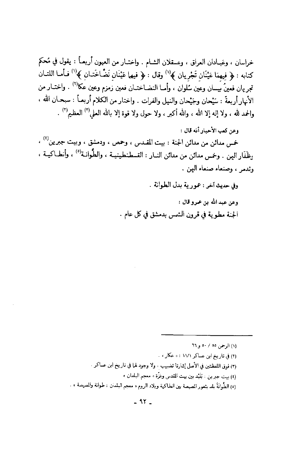 خرسان، وعبادان العراق، وعسقلان الشام. اختار من العيون أربعاً: يقول في محكم كتابه: " فيهما عينان تجريان " وقال: " فيهما عينان نضاختان " فأما اللتان تجريان فعين بيسان وعين سلوان، وأما النضاختان فعين زمزم وعين عكا. واختار من الأنهار أربعة: سيحان وجيحان والنيل والفرات. واختار من الكلام أربعاً: سبحان الله، والحمد لله، ولا إله إلا الله، والله أكبر، ولا حول ولا قوة إلا بالله العلي العظيم.