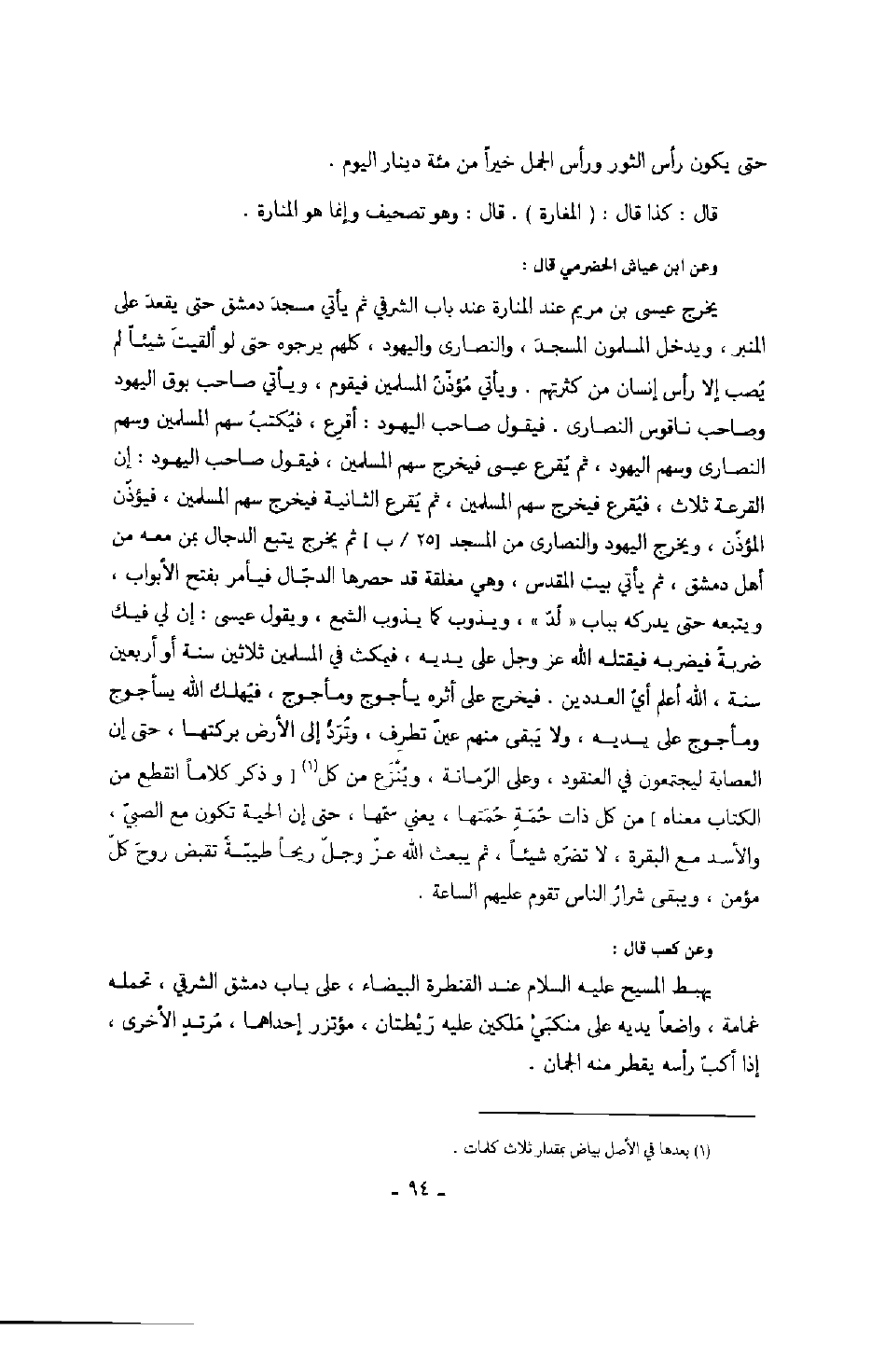 وعن ابن عياش الحضرمي قال: يخرج عيسى بن مريم عند المنارة عند باب الشرقي ثم يأتي مسجد دمشق حتى يقعد على المنبر، ويدخل المسلمون المسجد، والنصارى واليهود، كلهم يرجوه حتى لو ألقيت شيئاً لم يصب إلا رأس إنسان من كثرتهم. ويأتي مؤذن المسلمين فيقوم، ويأتي صاحب بوق اليهود وصاحب ناقوس النصارى. فيقول صاحب اليهود: أقرع، فيكتب سهم المسلمين وسهم النصارى وسهم اليهود، ثم يقرع عيسى فيخرج سهم المسلمين، فيقول صاحب اليهود القرعة ثلاث فيقرع فيخرج سهم المسلمين. ثم يقرع الثانية فيخرج سهم المسلمين، فيؤذن المؤذن، ويخرج اليهود والنصارى من المسجد ثم يخرج يتبع الدجال بمن معه من أهل دمشق، ثم يأتي بيت المقدس، وهي مغلقة قد حصرها الدجال فيأمر بفتح الأبواب، ويتبعه حتى يدركه بباب لد، ويذوب كما يذوب الشمع، ويقول عيسى: إن لي فيك ضربة فيضربه فيقتله الله عز وجل على يديه، فيمكث في المسلمين ثلاثين سنة أو أربعين سنة، الله أعلم أي العددين. فيخرج على أثره يأجوج ومأجوج، فيهلك الله يأجوج ومأجوج على يديه، ولا يبقى منهم عين تطرف وتزد إلى الأرض بركتها، حتى إن العصابة ليجتمعون في العنقود، وعلى الرمانة، وينزع من كل وذكر كلاماً انقطع من الكتاب معناه من كل ذات حمة حمتها، يعني سمها، حتى إن الحية تكون مع الصبي، والأسد مع البقرة، لا تضره شيئاً، ثم يبعث الله عز وجل ريحاً طيبة تقبض روح كل مؤمن، ويبقى شرار الناس تقوم عليهم الساعة.
