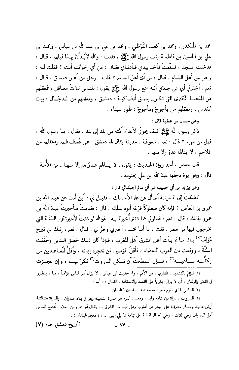 محمد بن المنكدر، ومحمد بن كعب القرظي، ومحمد بن علي بن عبد الله بن عباس، ومحمد بن علي بن الحسين بن فاطمة بنت رسول الله صَلَّى اللهُ عَلَيْهِ وَسَلَّمَ، فقلت: والله لأبدأن بهذا قبلهم، قال: فدخلت المسجد، فسلمت فأخذ بيدي فأدناني فقال: من أي إخواننا أنت؟ فقلت له: رجل من أهل الشام. قال: من أي أهل الشام؟ قلت: رجل من أهل دمشق. قال: نعم، أخبرني أبي عن جدي أنه سمع رسول الله صَلَّى اللهُ عَلَيْهِ وَسَلَّمَ يقول: " للناس ثلاث معاقل، فمعقلهم من الملحمة الكبرى التي تكون بعمق أنطاكية: دمشق، ومعقلهم من الدجال: بيت المقدس، ومعقلهم من يأجوج ومأجوج: طور سيناء ".