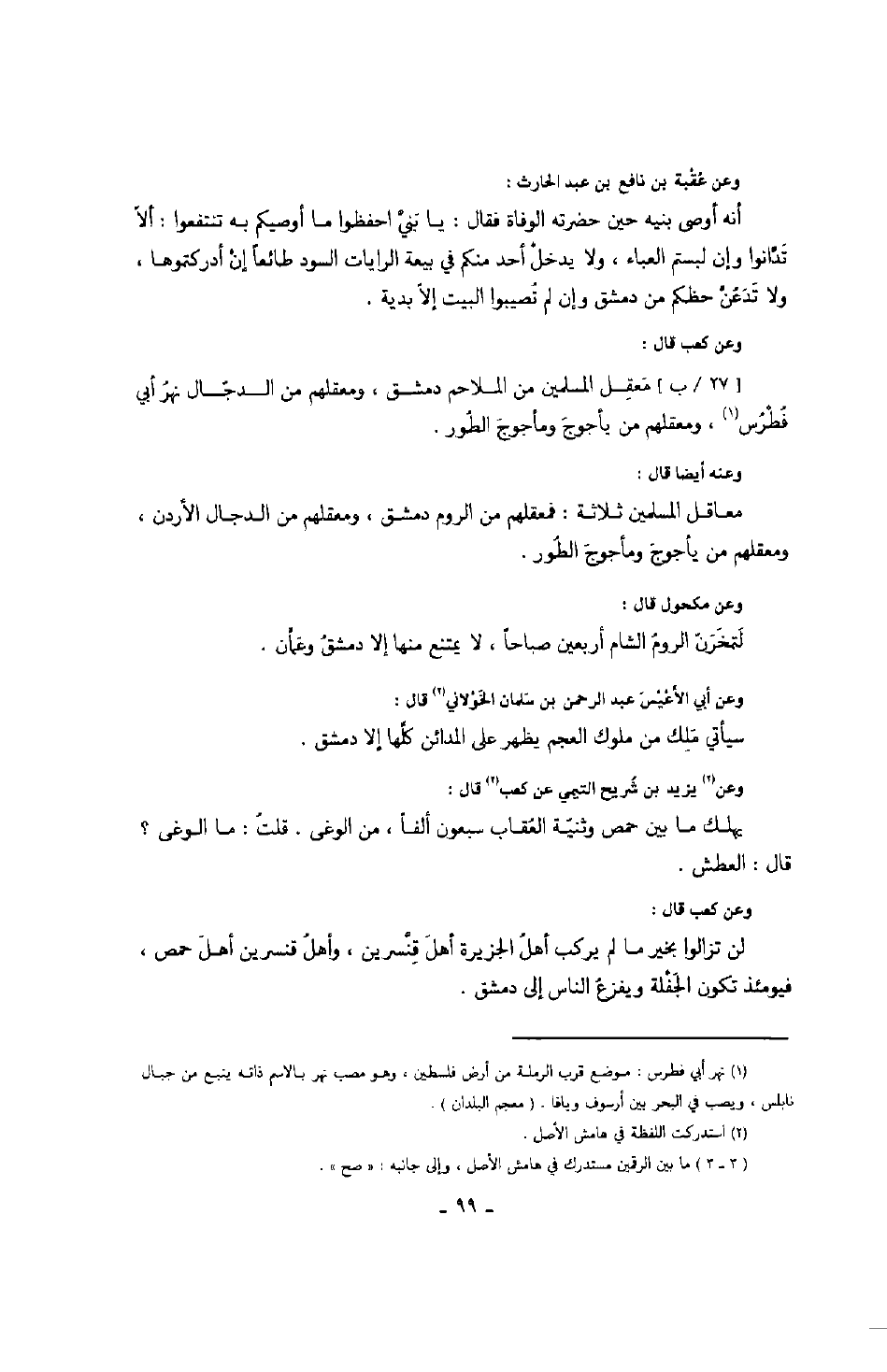 وعن كعب قال: معقل المسلمين من الملاحم دمشق، ومعقلهم من الدجال نهر أبي فطرس، ومعقلهم من يأجوج ومأجوج الطور.
