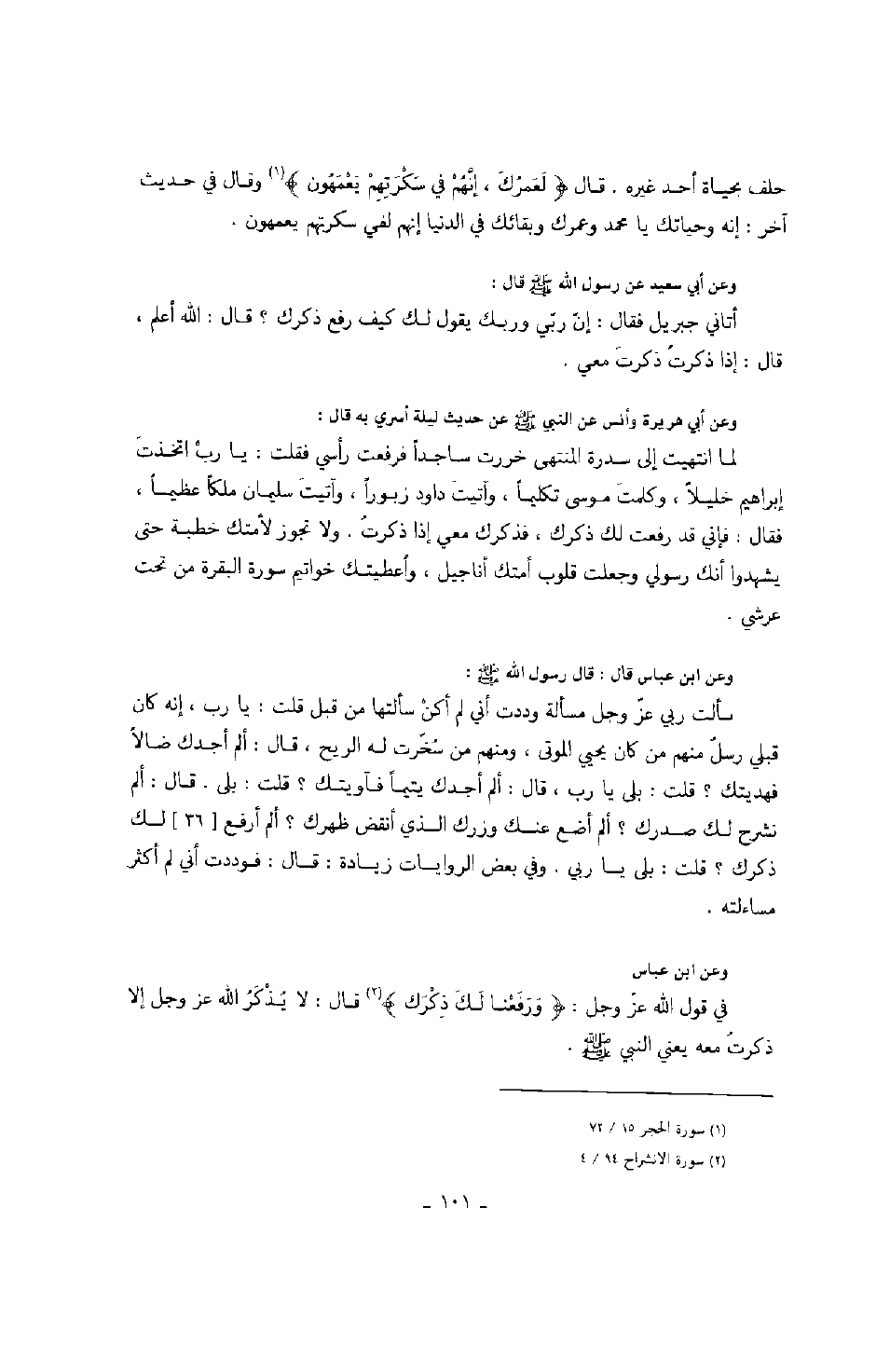 حلف بحياة أحد غيره. قال: " لعمرك، إنهم في سكرتهم يعمهون " وقال في حديث آخر: إنه وحياتك يا محمد وعمرك وبقائك في الدنيا إنهم لفي سكرتهم يعمهون. وعن أبي سعيد عن رسول الله صَلَّى اللهُ عَلَيْهِ وَسَلَّمَ قال: " أتاني جبريل فقال: إن ربي وربك يقول كيف رفع ذكرك؟ قال: الله أعلم، قال: إذا ذكرت ذكرت معي " وعن أبي هريرة وأنس رضي اله عنهما عن النبي صَلَّى اللهُ عَلَيْهِ وَسَلَّمَ عن حديث ليلة أسري به قال: " لما انتهيت إلى سدرة المنتهى خررت ساجداً فرفعت رأسي فقلت: يا رب اتخذت إبراهيم خليلاً، وكلمت عيسى تكليماً، وآتيت داود زبوراً، وآتيت سليمان ملكاً عظيماً، فقال: فإني قد رفعت لك ذكرك، فذكرك معي إذا ذكرت. ولا تجوز لأمتك خطبة حتى يشهدوا أنك وجعلت قلوب أمتك أناجيل، وأعطيتك خواتيم سورة البقرة من تحت عرشي ". وعن ابن عباس قال: قال رسول الله صَلَّى اللهُ عَلَيْهِ وَسَلَّمَ: " سألت ربي عز وجل مسألة وددت أني لم أكن سألتها من قبل قلت: يا رب، إنه كان قبلي منهم من كان يحيي الموتى، ومنهم من سخرت له الريح، قال: ألم أجدك ضالاً فهديتك؟ قلت: بلى يا رب، قال: ألم أجدك يتيماً فآويتك؟ قلت: بلى. قال: ألم نشرح صدرك؟ ألم أضع عنك وزرك الذي أنقض ظهرك؟ ألم أرفع لك ذكرك؟ قلت: بلى يا ربي ". وفي بعض الروايات زيادة: قال: فوددت أني لم أكثر مساءلته. وعن ابن عباس: في قول الله عز وجل: " ورفعنا لك ذكرك " قال: لا يذكرون الله عز وجل إلا ذكرت معه يعني النبي صَلَّى اللهُ عَلَيْهِ وَسَلَّمَ.