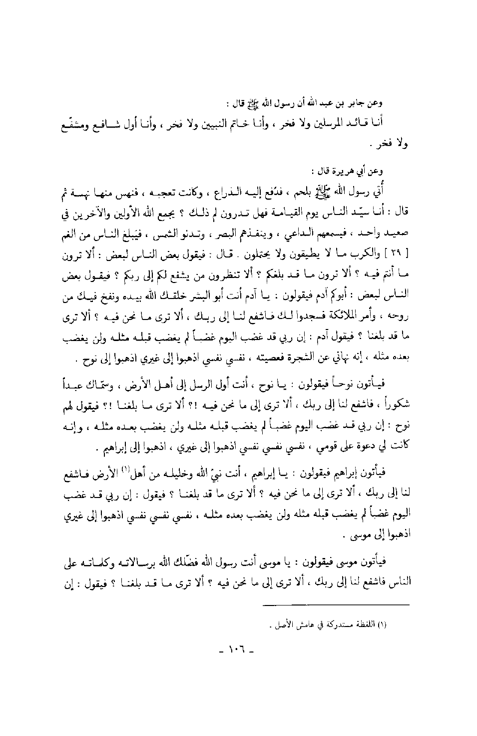 وعن جابر بن عبد الله رضي الله عنه قال: أن رسول الله صَلَّى اللهُ عَلَيْهِ وَسَلَّمَ قال: " أنا قائد المرسلين ولا فخر، وأنا خاتم النبيين ولا فخر، وأنا أول شافع ومشفع ولا فخر ". وعن أبي هريرة رضي الله عنه قال: أتي رسول الله صَلَّى اللهُ عَلَيْهِ وَسَلَّمَ بلحم، فدفع إليه الذراع، وكانت تعجبه، فنهس منها نهسة ثم قال: " أنا سيد الناس يوم القيامة فهل تدرون لم ذلك؟ يجمع الله الأولين والآخرين في صعيد واحد، فيسمعهم الداعي، وينفذهم البصر، وتدنو الشمس، فيبلغ الناس من الغم والكرب ما لا يطيقون ولا يحتملون. قال: فيقول بعض الناس لبعض: ألا ترون ما أنتم فيه؟ ألا ترون ما قد بلغكم؟ ألا تنظرون من يشفع لكم إلى ربكم؟ فيقول بعض الناس لبعض: أبوكم آدم فيقولون: يا آدم أنت أبو البشر خلقك الله بيده ونفخ فيك روحه، وأمر الملائكة فسجدوا لك فاشفع لنا إلى ربك، ألا ترى ما نحن فيه؟ ألا ترى ما قد بلغنا؟ فيقول آدم: إن