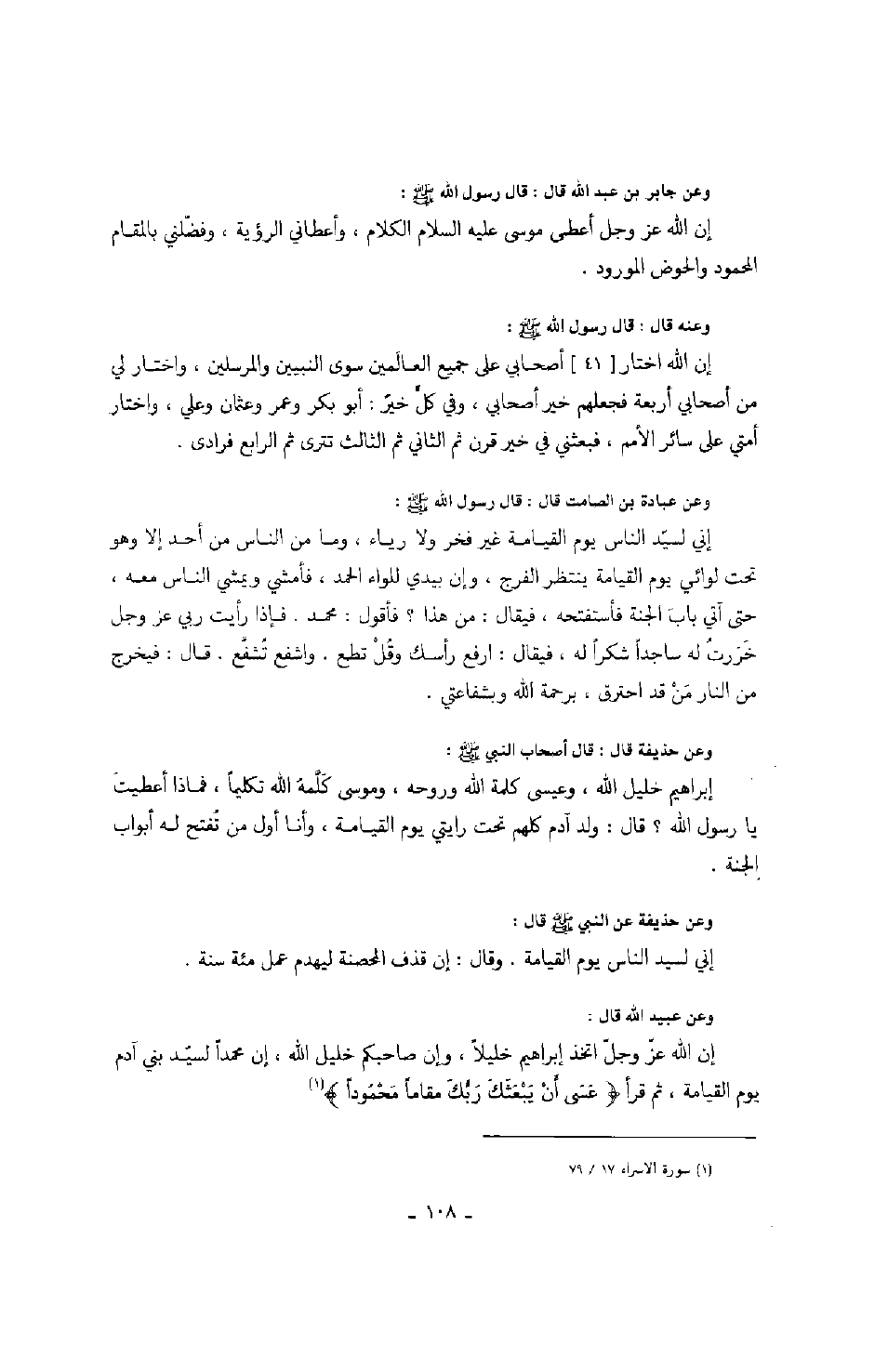 وعن جابر بن عبد الله رضي الله عنه أن النبي صَلَّى اللهُ عَلَيْهِ وَسَلَّمَ قال: " أنا قائد المرسلين ولا فخر، وأنا خاتم النبيين ولا فخر، وأنا أول شافع وأول مشفع ولا فخر "، وفي رواية أخرى: أنا قائد المسلمين. وعن جابر بن عبد الله رضي الله عنه قال: قال رسول الله صَلَّى اللهُ عَلَيْهِ وَسَلَّمَ: " إن الله عز وجل أعطى موسى عليه السلام الكلام، وأعطاني الرؤية، وفضلني بالمقام المحمود والحوض المورود ". وعنه قال: قال رسول الله صَلَّى اللهُ عَلَيْهِ وَسَلَّمَ: " إن الله اختار أصحابي على جميع العالمين سوى النبيين والمرسلين، واختار لي من أصحابي أربعة فجعلهم خير أصحابي، وفي كل خيرٌ: أبو بكر وعمر وعثمان وعي، واختار أمتي على سائر الأمم، فبعثني في خير قرن ثم الثاني ثم الثالث تترى ثم الرابع فرادى ". وعن عبادة بن الصامت رضي الله عنه قال: قال رسول الله صَلَّى اللهُ عَلَيْهِ وَسَلَّمَ: " إني لسيد الناس يوم القيامة غير فخر ولا رياء، وما من الناس من أحد إلا وهو تحت لوائي يوم القيامة ينتظر الفرج، وإن بيدي للواء الحمد، فأمشي ويمشي الناس معه، حتى آتي باب الجنة فأستفتحه، فيقال: من هذا؟ فأقول: محمد. فإذا رأيت ربي عز وجل خررت له ساجداً شكراً له، فيقال: ارفع رأسك وقل تطع. واشفع تشفع. قال: فيخرج من النار من قد احترق، برحمة الله وبشفاعتي ". وعن حذيفة قال: قال أصحاب النبي صَلَّى اللهُ عَلَيْهِ وَسَلَّمَ: إبراهيم خليل الله، وعيسى كلمة الله وروحه، وموسى كلمه الله تكليماً، فماذا أعطيت يا رسول الله؟ قال: " ولد آدم كلهم تحت رايتي يوم القيامة، وأنا أول من تفتح له أبواب الجنة ". وعن حذيفة رضي الله عنه عن النبي صَلَّى اللهُ عَلَيْهِ وَسَلَّمَ قال: " إني لسيد الناس يوم القيامة ". وقال: " إن قذف المحصنة ليهدم عمل مئة سنة ". وعن عبيد الله قال: إن الله عز وجل اتخذ إبراهيم خليلاً، وإن صاحبكم خليل الله، وإن محمداً لسيد بني آدم يوم القيامة، ثم قرأ " عسى أن يبعثك ربك مقاماً محموداً ".