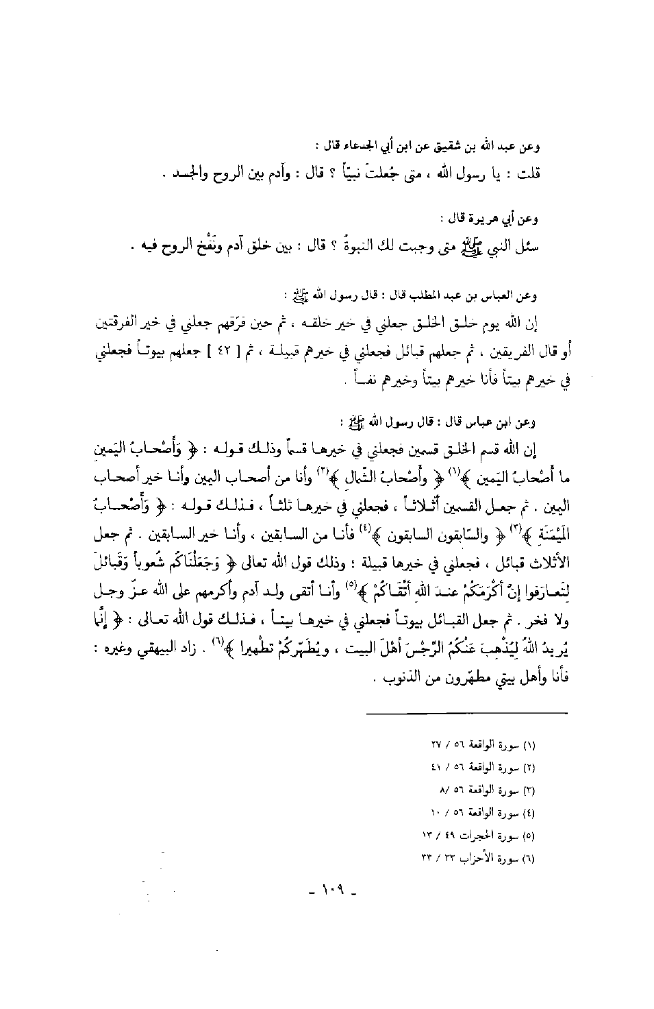 الفرقتين أو قال: الفريقين، ثم جعلهم قبائل فجعلني في خيرهم قبيلة، ثم جعلهم بيوتاً فجعلني في خيرهم بيتاً فأنا خيرهم بيتاً وخيرهم نفساً ". وعن ابن عباس قال: قال رسول الله صَلَّى اللهُ عَلَيْهِ وَسَلَّمَ: " إن الله قسم الخلق قسمين فجعلني في خيرهم قسماً وذلك قوله: " وأصحاب اليمين وما أصحاب اليمين " " وأصحاب الشمال " وأنا من أصحاب اليمين وأنا خير أصحاب اليمين. أو قال: الفريقين، ثم جعلهم قبائل فجعلني في خيرهم قبيلة، ثم جعلهم بيوتاً فجعلني في خيرهم بيتاً فأنا خيرهم بيتاً وخيرهم نفساً ". وعن ابن عباس قال: قال رسول الله صَلَّى اللهُ عَلَيْهِ وَسَلَّمَ: " إن الله قسم الخلق قسمين فجعلني في خيرهم قسماً وذلك قوله: " وأصحاب اليمين وما أصحاب اليمين " " وأصحاب الشمال " وأنا من أصحاب اليمين وأنا خير أصحاب اليمين.