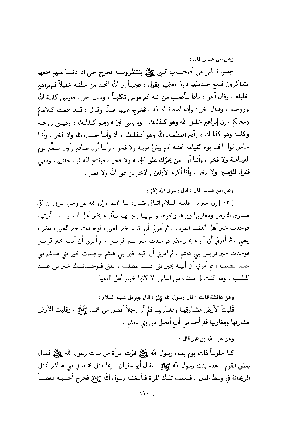 وقال آخر: ماذا بأعجب من أنه كلم موسى تكليماً، وقال آخر: فعيسى كلمة الله وروحه، وقال آخر: وآدم اصطفاه الله، فخرج عليهم فسلم وقال: " قد سمعت كلامكم وعجبكم، إن إبراهيم خليل الله وهو كذلك، وموسى نجيه وهو كذلك، وعيسى روحه وكلمته وهو كذلك، وآدم اصطفاه الله وهو كذلك، ألا وأنا حبيب الله ولا فخر، وأنا حامل لواء الحمد يوم القيامة تحته آدم ومن دونه ولا فخر، وأنا أول شافع وأول مشفع يوم القيامة ولا فخر، وأنا أول من يحرك غلق الجنة ولا فخر، فيفتح الله فيدخلنيها ومعي فقراء المؤمنين ولا فخر، وأنا أكرم الأولين والآخرين على الله ولا فخر ". وعن ابن عباس قال: قال رسول الله صَلَّى اللهُ عَلَيْهِ وَسَلَّمَ: " إن جبريل عليه السلام أتاني فقال: يا محمد، إن الله عز وجل أمرني أن آتي مشارق الأرض ومغاربها وبرها وبحرها وسهلها وجبلها فآتيه بخير أهل الدنيا، فأتيتها فوجدت خير أهل الدنيا العرب، ثم أمرني أن آتيه بخير العرب فوجدت خير العرب مضر، يعني، ثم أمرني أن آتيه بخير مضر فوجدت خير مضر قريش، ثم أمرني أن آتيه بخير قريش، فوجدت خير قريش بني هاشم، ثم أمرني أن آتيه بخير بني هاشم فوجدت خير بني هاشم بني عبد المطلب، ثم أمرني أن آتيه بخير بني عبد المطلب، يعني فوجدتك خير بني عبد المطلب، وما كنت في صنف من الناس إلا كانوا خيار أهل الدنيا ". عن عائشة رضي الله عنها قالت: قال رسول الله صَلَّى اللهُ عَلَيْهِ وَسَلَّمَ: قال جبريل عليه السلام: " قلبت الأرض مشارقها ومغاربها فلم أر رجلاً أفضل من محمد صَلَّى اللهُ عَلَيْهِ وَسَلَّمَ، وقلبت الأرض مشارقها ومغاربها فلم أجد بني أبٍ أفضل من بني هاشم ". وعن عبد الله بن عمر قال: كنا جلوساً ذات يوم بفناء رسول الله صَلَّى اللهُ عَلَيْهِ وَسَلَّمَ فمرت امرأة من بنات رسول الله صَلَّى اللهُ عَلَيْهِ وَسَلَّمَ فقال بعض القوم: هذه بنت رسول الله صَلَّى اللهُ عَلَيْهِ وَسَلَّمَ. فقال أبو سفيان: إنما مثل محمد صَلَّى اللهُ عَلَيْهِ وَسَلَّمَ في بني هاشم كمثل الريحانة في وسط التين، فسمعت تلك المرأة فأبلغته رسول الله صَلَّى اللهُ عَلَيْهِ وَسَلَّمَ فخرج أحسبه مغضباً
