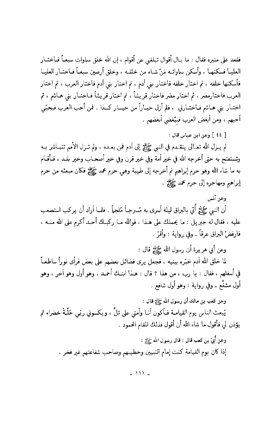 فقعد على منبره فقال: " ما بال أقوال تبلغني عن أقوام، إن الله خلق سماوات سبعاً فاختار العليا فسكنها، وأسكن سماواته من شاء من خلقه، وخلق أرضين سبعاً فاختار العليا فأسكنها خلقه، ثم اختار خلقه فاختار بني آدم، ثم اختار بني آدم فاختار العرب، ثم اختار العرب فاختار مضر، ثم اختار مضر فاختار قريشاً، ثم اختار قريشاً فاختار بني هاشم، ثم اختار بني هاشم فاختارني، فلم أزل خياراً من خيار كذا. فمن أحب العرب فبحبي أحبهم، ومن أبغض العرب فببغضي أبغضهم ". عن ابن عباس قال: لم يزل الله تعالى يتقدم في النبي صَلَّى اللهُ عَلَيْهِ وَسَلَّمَ إلى آدم فمن بعده، ولم تزل الأمم تتباشر به وتستفتح به حتى أخرجه الله خير في خير أمة وفي خير قرن وفي خير أصحاب وخير بلد، فأقام به ما شاء الله وهو حرم إبراهيم ثم أخرجه إلى طيبة وهي حرم محمد صَلَّى اللهُ عَلَيْهِ وَسَلَّمَ فكان مبعثه من حرم إبراهيم ومهاجره إلى حرم محمد صَلَّى اللهُ عَلَيْهِ وَسَلَّمَ. وعن أنس صَلَّى اللهُ عَلَيْهِ وَسَلَّمَ أتي بالبراق ليلة أسرى به مسرجاً ملجماً.