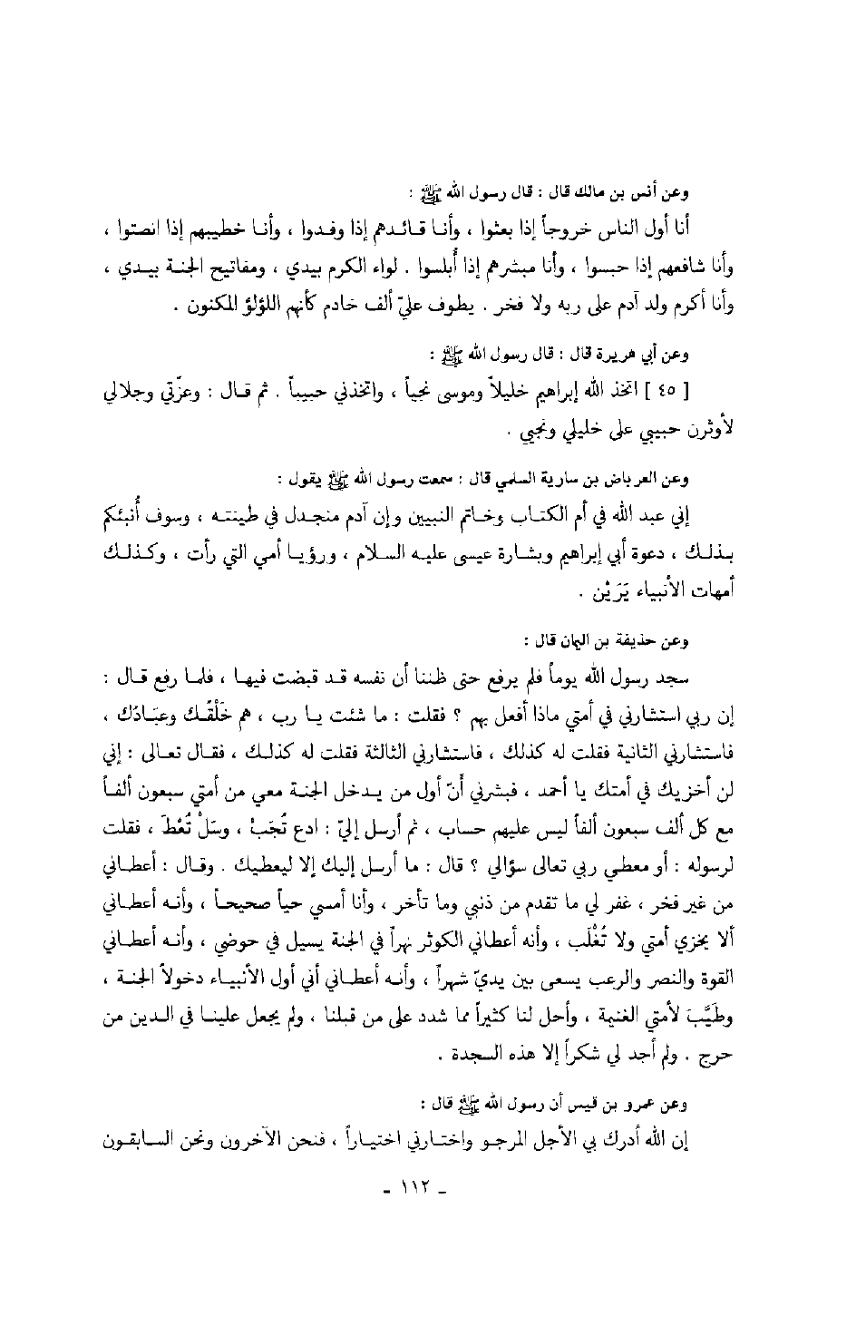 وعن انس بن مالك رضي الله عنه قال: قال رسول الله صَلَّى اللهُ عَلَيْهِ وَسَلَّمَ: " أنا أول الناس خروجاً إذا بعثوا، وأنا قائدهم إذا وفدوا، وأنا خطيبهم إذا نصتوا، وأنا شافعهم إذا حبسوا، وأنا مبشرهم إذا أبلسوا. لواء الكرم بيدي ومفاتيح الجنة بيدي، وأنا أكرم ولد آدم على ربه ولا فخر، يطوف علي ألف خادم كأنهم اللؤلؤ المكنون ". وعن أبي هريرة رضي الله عنه قال: قال رسول الله صَلَّى اللهُ عَلَيْهِ وَسَلَّمَ: " اتخذ الله إبراهيم خليلاً وموسى نجياً، واتخذني حبيباً. ثم قال: وعزتي وجلالي لأوثرن حبيبي على خليلي ونجيي ". وعن العرباض بن سارية رضي الله عنه قال: سمعت رسول الله صَلَّى اللهُ عَلَيْهِ وَسَلَّمَ يقول: " إني عبد الله في أم الكتاب وخاتم النبيين وإن آدم منجدل في طينته، وسوف أنبئكم بذلك، دعوة أبي إبراهيم وبشارة عيسى عليه السلام، ورؤيا أمي التي رأت، وكذلك أمهات الأنبياء يرين ". وعن حذيفة بن اليمان رضي الله عنه قال: سجد رسول الله يوماً فلم يرفع حتى ظننا أن نفسه قبضت فيها، فلما رفع قال: " إن ربي استشارني في أمتي ماذا أفعل بهم؟ فقلت: ما شئت يا رب، هم خلقك وعبادك، فاستشارني الثانية فقلت له كذلك، فاستشارني الثالثة فقلت لم كذلك، فقال تعالى: إني لن أخزيك في أمتك يا أحمد، فبشرني أن أول من يدخل الجنة معي من أمتي سبعون ألفاً مع كل ألف سبعون ألفاً ليس عليهم حساب، ثم أرسل إلي: ادع تجب، وسل تعط، فقلت لرسوله: أو معطي ربي تعالى سؤالي؟ قال: ما أرسل إليك إلا ليعطيك. وقال: أعطاني من غير فخر، غفر لي ما تقدم من ذنبي وما تأخر، وأنا أمسي حياً صحيحاً، وأنه أعطاني ألا يخزي أمتي ولا تغلب، وأنه أعطاني الكوثر نهراً في الجنة يسيل في حوض، وأنه أعطاني القوة والنصر والرعب يسعى بين يدي شهراً، وأنه أعطاني أني أول الأنبياء دخولاً الجنة، وطيب لأمتي الغنيمة، وأحل لنا كثيراً مما شدد على من قبلنا، ولم يجعل علينا في الدين من حرج، ولم أجد لي شكراً غير هذه السجدة ". وعن عمرو بن قيس رضي الله عنه أن رسول الله صَلَّى اللهُ عَلَيْهِ وَسَلَّمَ قال: " إن الله أدرك بي الأجل المرجو واختارني اختياراً، فنحن الآخرون ونحن السابقون