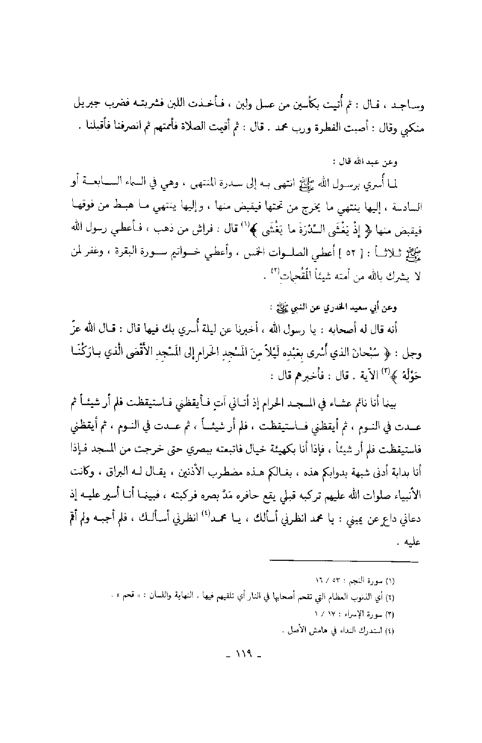 وساجد، قال: ثم أتيت بكأسين من عسل ولبن، فأخذت اللبن فشربته فضرب جبريل عليه السلام منكبي وقال: أصبت الفطرة ورب محمد. قال: ثم أقيمت الصلاة فأممتهم ثم انصرفنا فأقبلنا. وعن عبد الله قال: لما أسرى برسول الله صَلَّى اللهُ عَلَيْهِ وَسَلَّمَ انتهى إلى سدرة المنتهى، وهي في السماء السابعة أو السادسة، إليها ينتهي ما يخرج من تحتها فيقبض منها، وإليها ما هبط من فوقها فيقبض منها " إذ يغشى السدرة ما يغشى " قال: فراش من ذهب، فأعطى رسول الله صَلَّى اللهُ عَلَيْهِ وَسَلَّمَ ثلاثاً: أعطي الصلوات الخمس، وأعطي خواتيم سورة البقرة، وغفر لمن لا يشرك بالله من أمته شيئاً المقحمات. وعن أبي سعيد الخدري رضي الله عنه عن النبي صَلَّى اللهُ عَلَيْهِ وَسَلَّمَ: أنه قال له أصحابه: يا رسول الله، أخبرنا عن ليلة أسري بك فيها قال: قال الله عز وجل: " سبحان الذي أسرى بعبده ليلاً من المسجد الحرام إلى المسجد الأقصى الذي باركنا حوله " الآية. قال: فأخبرهم قال: بينما أنا نائم عشاء في المسجد الحرام إذ أتاني آتٍ فأيقظني فاستيقظت فلم أر شيئاً ثم عدت في النوم، ثم أيقظني فاستيقظت، فلم أر شيئاً، ثم عدت في النوم، ثم أيقظني فاستيقظت فلم أر شيئاً، فإذا أنا بكهيئة خيال فاتبعته ببصرى حتى خرجت من المسجد فإذا أنا بدابة أدنى شبهة بدوابكم هذه، بغالكم هذه مضطرب الأذنين، يقال له البراق، وكانت الأنبياء صلوات الله عليهم تركبه قبلي يقع حافره مد بصره فركبته،