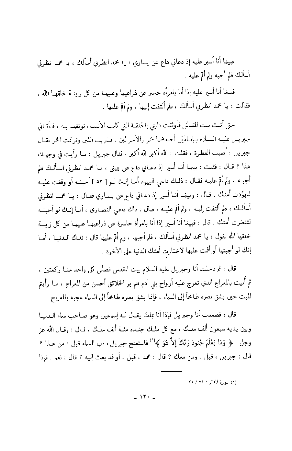 فبينما أنا أسير عليه إذ دعاني داعٍ عن يميني: يا محمد انظرني أسألك، يا محمد انظرني أسألك، فلم أجبه ولم أقم عليه. فبينما أنا أسير عليه إذ دعاني داع عن يساري: يا محمد انظرني أسألك، يا محمد انظرني أسألك فلم أجبه ولم أقم عليه. فبينما أنا أسير عليه إذا أنا بامرأة حاسر عن ذراعيها وعليها من كل زينة خلقها الله، فقالت: يا محمد انظرني أسألك، فلم ألتفت إليها، ولم أقم عليها.