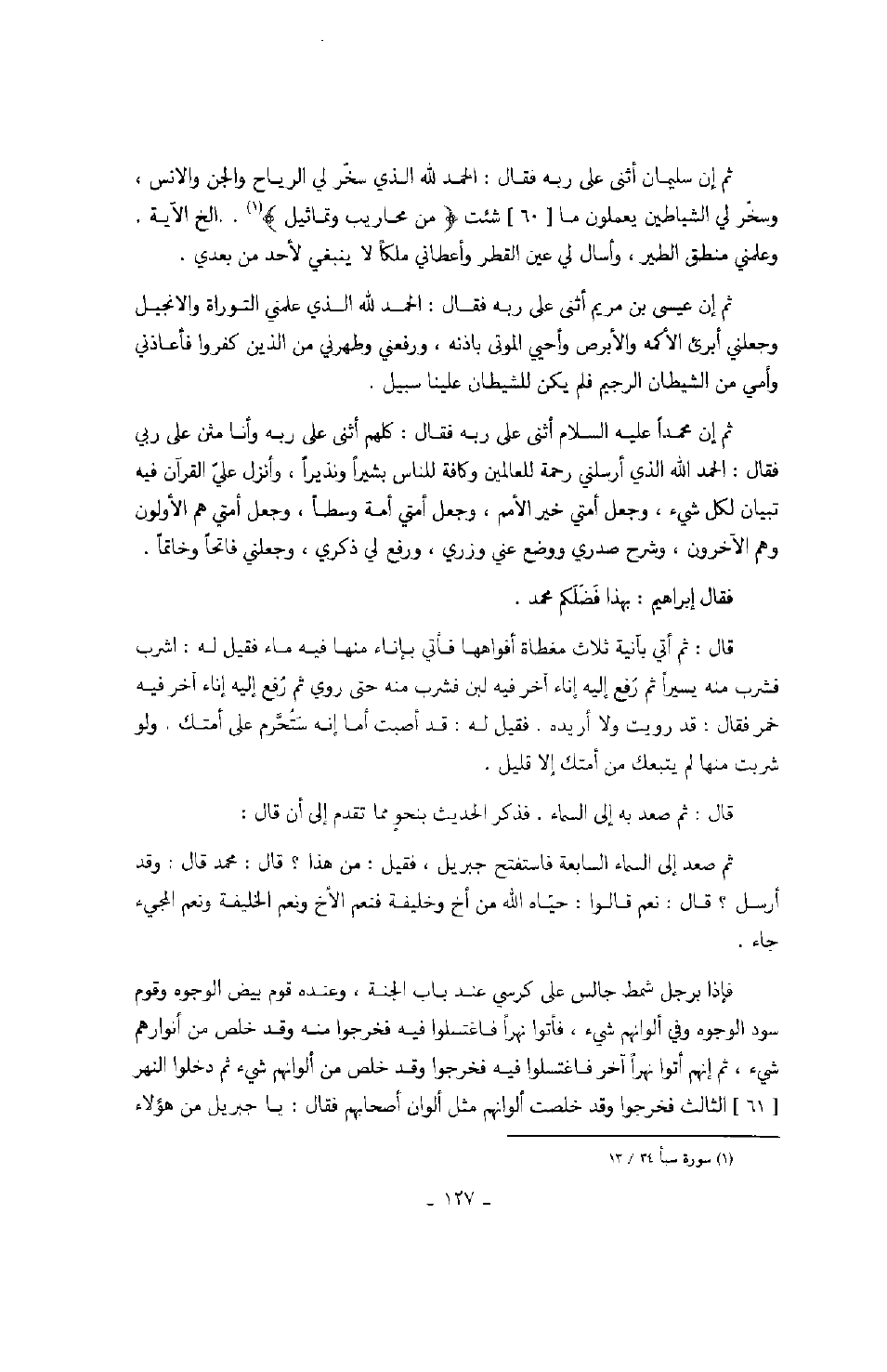 ثم إن سليمان عليه السلام أثنى على ربه فقال: الحمد لله الذي سخر لي الرياح والجن والإنس، وسخر لي الشياطين يعملون ما شئت " من محاريب وتماثيل ".. إلى آخر الآية. وعلمني منطق الطير، وأسأل لي عين القطر وأعطاني ملكاً لا ينبغي لأحد من بعدي. ثم إن عيسى بن مريم عليهما السلام أثنى على ربه فقال: الحمد لله الذي علمني التوراة والإنجيل وجعلني أبرئ الأكمه والأبرص وأحيي الموتى بإذنه، ورفعني وطهرني من الذين كفروا فأعادني وأمي من الشيطان الرجيم فلم يكن للشيطان علينا سبيل.