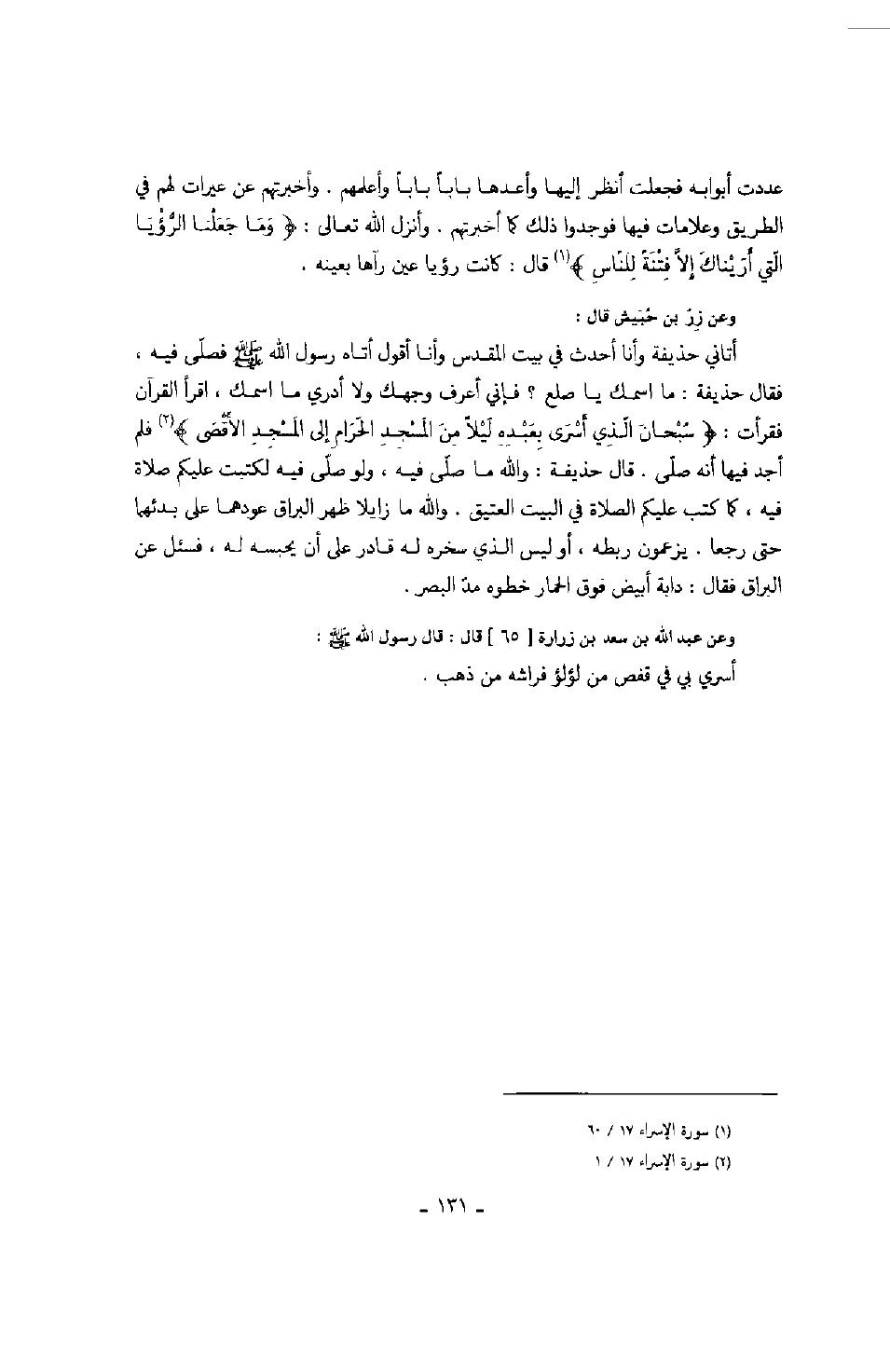 عددت أبوابه فجعلت أنظر إليها وأعدها باباً باباً وأعلمهم. وأخبرتهم عن عيرات لهم في الطريق وعلامات فيها فوجدوا ذلك كما أخبرتهم. وأنزل الله تعالى: " وما جعلنا الرؤيا التي أريناك إلا فتنةً للناس " قال: كانت رؤيا عين رآها بعينه. وعن زر بن حبيش قال: أتاني حذيفة وأنا أحدث في بيت المقدس وأنا أقول أنا رسول الله صَلَّى اللهُ عَلَيْهِ وَسَلَّمَ فصلى فيه، فقال حذيفة: ما اسمك يا صلع؟ فإني أعرف وجهك ولا أدري ما اسمك، اقرأ القرآن فقرأت: " سبحان الذي أسرى بعبده ليلاً من المسجد الحرام إلى المسجد الأقصى " فلم أجد فيها أنه صلى. قال حذيفة: والله ما صلى فيه، ولو صلى فيه لكتبت عليكم صلاة فيه، كما كتب عليكم الصلاة في البيت العتيق. والله ما زايلا طهر البراق عودهما على بدئهما حتى رجعا. يزعمون ربطه، أو ليس سخره له قادر على أن يحبسه له، فسئل البراق فقال: دابة أبيض فوق الحمار خطوه مد البصر. وعن عبد الله بن سعد بن زرارة ما قال: قال رسول الله صَلَّى اللهُ عَلَيْهِ وَسَلَّمَ: " أسري بي في قفص من لؤلؤ فراشه من ذهب ".