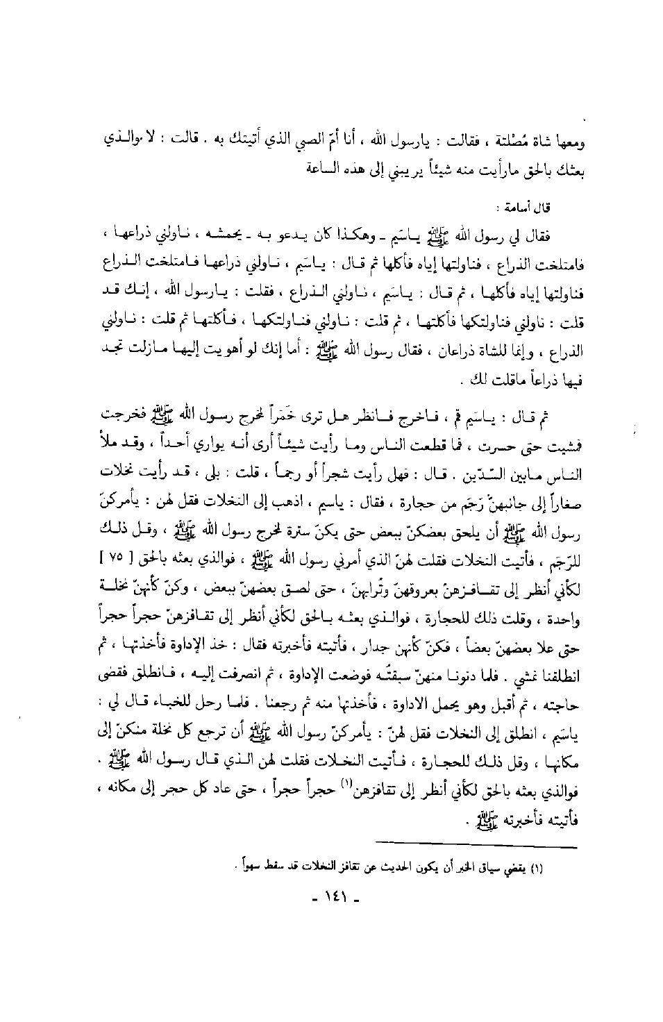 ومعها شاة مصلتة، فقالت: يا رسول الله، أنا أم الصبي الذي أتيتك به. قالت: لا والذي بعثك بالحق ما رأيت منه شيئاً يريبني إلى هذه الساعة. قال أسامة: فقال رسول الله صَلَّى اللهُ عَلَيْهِ وَسَلَّمَ يا سيم وهكذا كان يدعو به يحشمه، ناولني ذراعها، فامتلخت الذراع، فناولتها إياه فأكلها ثم قال: يا سيم، ناولني الذراع، فقلت: يا رسول الله، إنك قد قلت: ناولني فناولتكها فأكلتها، ثم قلت: ناولني فناولتكها، فأكلتها ثم قلت: ناولني الذراع، وإنما للشاة ذراعان، فقال رسول الله صَلَّى اللهُ عَلَيْهِ وَسَلَّمَ: أما إنك لو أهويت إليها ما زالت تجد فيها ذراعاً ما قلت لك. ثم قال: يا سيم قم، فاخرج فانظر هل ترى خمراً لمخرج رسول الله صَلَّى اللهُ عَلَيْهِ وَسَلَّمَ فخرجت فمشيت حتى حسرت، فما قطعت الناس وما رأيت شيئاً أرى أنه يواري أحداً، وقد ملأ الناس ما بين السدين.