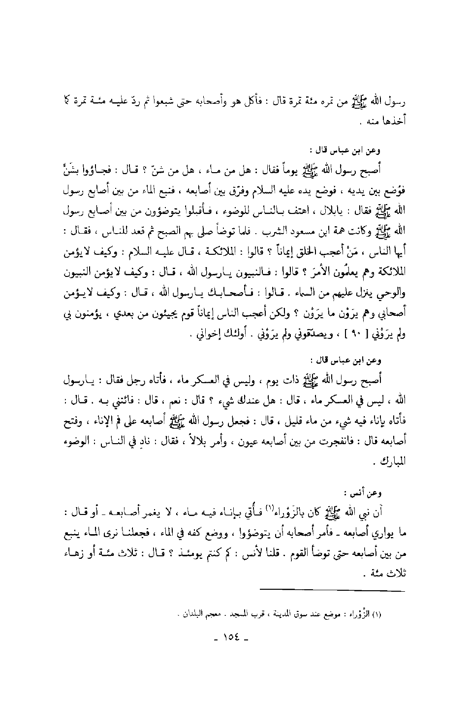 رسول الله صَلَّى اللهُ عَلَيْهِ وَسَلَّمَ من تمره مئة تمرة قال: فأكل هو وأصحابه حتى شبعوا ثم رد عليه مئة تمرة كما أخذها منه. وعن ابن عباس قال: أصبح رسول الله صَلَّى اللهُ عَلَيْهِ وَسَلَّمَ يوماً فقال: هل من ماء، هل من شن؟ قال: فجاؤوا بشنٍّ فوضع بين يديه، فوضع يده عليه السلام وفرق أصابعه، فنبع الماء من بين أصابع رسول الله صَلَّى اللهُ عَلَيْهِ وَسَلَّمَ فقال: يا بلال، اهتف بالناس للوضوء، فأقبلوا يتوضؤون من بين أصابع رسول الله صَلَّى اللهُ عَلَيْهِ وَسَلَّمَ وكانت همة ابن مسعود الشرب.