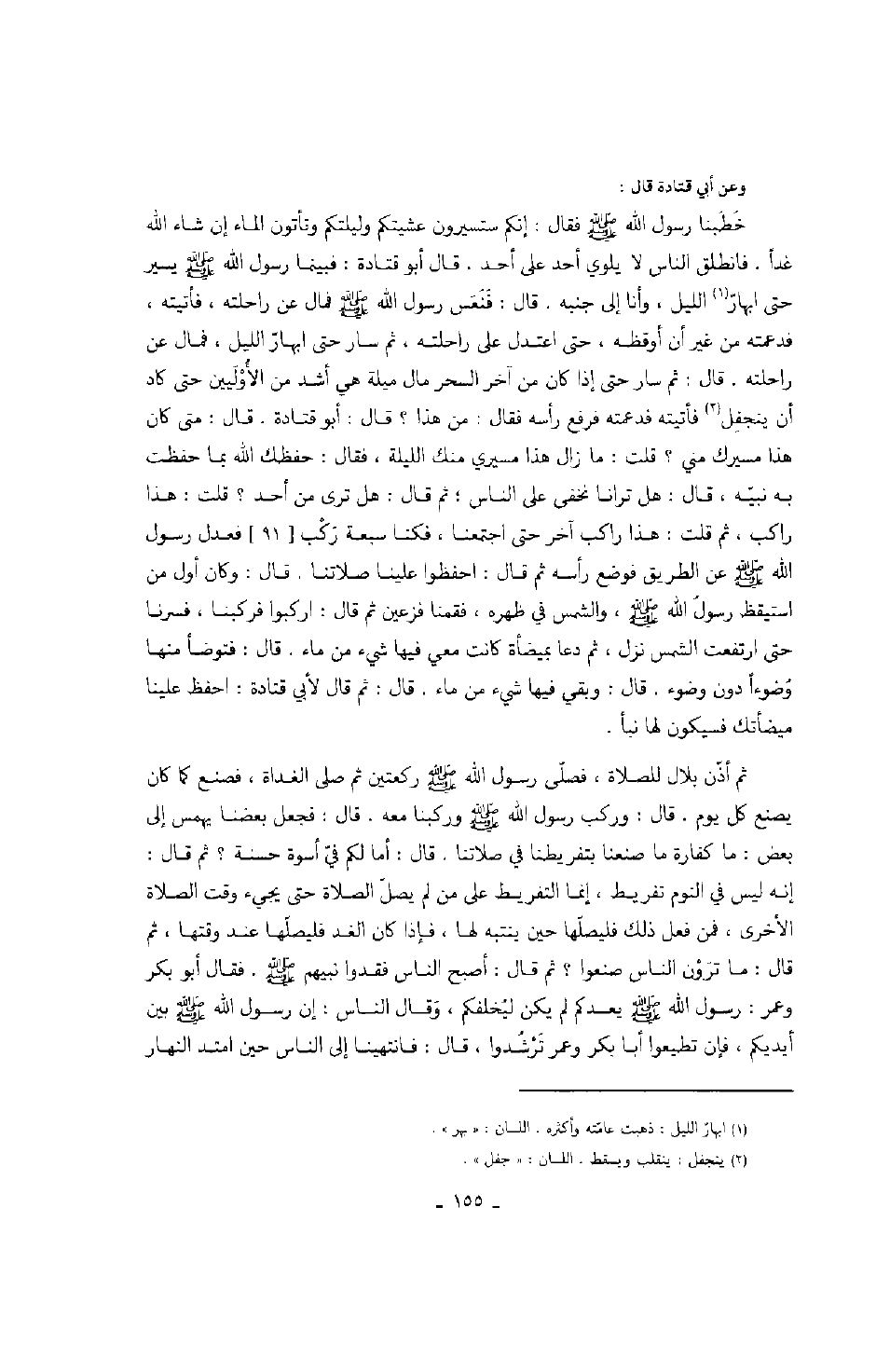 وعن أبي قتادة قال: خطبنا رسول الله صَلَّى اللهُ عَلَيْهِ وَسَلَّمَ فقال: إنكم ستسيرون عشيتكم وليلتكم وتأتون الماء إن شاء الله غداً. فانطلق الناس لا يلوي أحد على أحد. قال أبو قتادة: فبينما رسول الله صَلَّى اللهُ عَلَيْهِ وَسَلَّمَ يسير حتى ابهار الليل، وأنا إلى جنبه. قال: فنعس رسول الله صَلَّى اللهُ عَلَيْهِ وَسَلَّمَ فمال عن راحلته، فأتيته، فدعمته من غير أن أوقظه، حتى اعتدل على راحلته، ثم سار حتى ابهار الليل، فمال عن راحلته. قال: ثم سار حتى إذا كان من آخر السحر مال ميلة هي أشد من الأوليين حتى كاد أن ينجفل فأتيته فدعمته فرفع رأسه فقال: من هذا؟ قال: أبو قتادة. قال: متى كان هذا مسيرك مني؟ قلت: مازال هذا مسيري منك الليلة، فقال: حفظك الله بما حفظت به نبيه، قال: هل ترانا نخفى على الناس؛ ثم قال: هل ترى من أحد؟ قلت: هذا راكب، ثم قلت: هذا راكب آخر حتى اجتمعنا، فكنا سبعة ركب فعدل رسول الله صَلَّى اللهُ عَلَيْهِ وَسَلَّمَ عن الطريق فوضع رأسه ثم قال: احفظوا علينا صلاتنا. قال: وكان أول من استيقظ رسول الله صَلَّى اللهُ عَلَيْهِ وَسَلَّمَ، والشمس في ظهره، فقمنا فزعين ثم قال: اركبوا فركبنا، فسرنا حتى ارتفعت الشمس نزل، ثم دعا بميضأة كانت معي فيها شيء من ماء. قال: فتوضأ منها وضوءاً دون وضوء. قال: وبقي فيها شيء من ماء. قال: ثم قال لأبي قتادة: احفظ علينا ميضأتك فسيكون لها نبأ. ثم أذن بلال للصلاة، فصلى رسول الله صَلَّى اللهُ عَلَيْهِ وَسَلَّمَ ركعتين ثم صلى الغداة، فصنع كما كان يصنع كل يوم.