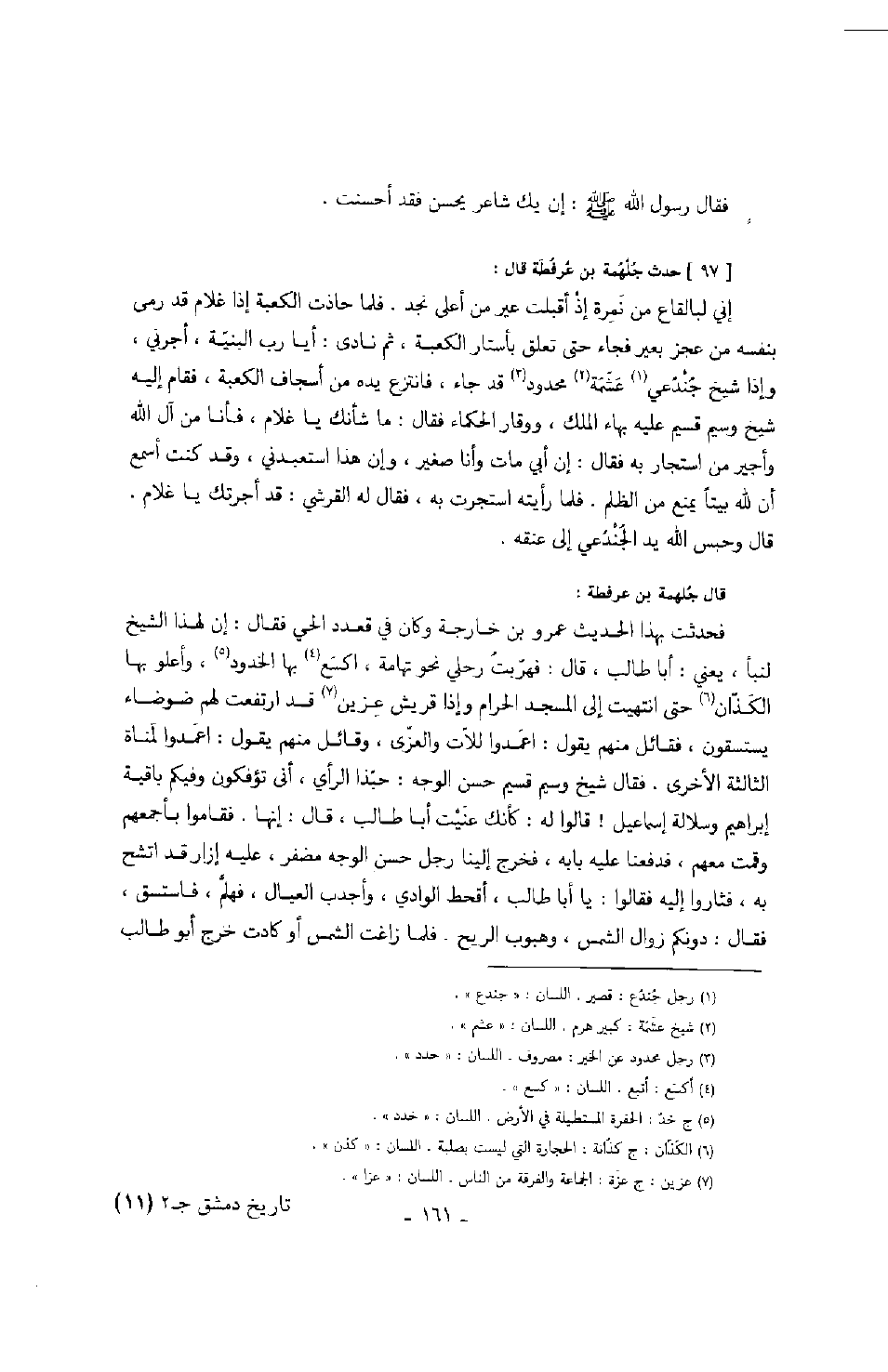 فقال رسول الله صَلَّى اللهُ عَلَيْهِ وَسَلَّمَ: إن يك شاعر يحسن فقد أحسنت. حدث جلهمة بن عرفطة قال: إني لبالقاع من نمرة إذ أقبلت عير من أعلى نجد. فلما حاذت الكعبة إذا غلام قد رمى بنفسه من عجز بعير فجاء حتى تعلق بأستار الكعبة، ثم نادى: أيا رب البنيّة، أجرني، وإذا شيخ جندعي عشمة محدود قد جاء، فانتزع يده من أسجاف الكعبة، فقام إليه شيخ وسيم قسيم عليه بهاء الملك، ووقار الحكماء فقال: ما شأنك يا غلام، فأنا من آل الله وأجير من استجار به فقال: إن أبي مات وأنا صغير، وإن هذا استعبدني، وقد كنت أسمع أن لله بيتاً يمنع من الظلم. فلما رأيته استجرت به، فقال له القرشي: قد أجرتك يا غلام. قال وحبس الله يد الجندعي إلى عنقه. قال جلهمة بن عرفطة: فحدثت بهذا الحديث عمرو بن خارجة وكان في قعدد الحي فقال: إن لهذا الشيخ لنبأ، يعني: أبا طالب، قال: فهربت رحلي نحو تهامة، اكسع بها الخدود، وأعلو بها الكذّان حتى انتهيت إلى المسجد الحرام وإذا قريش عزين قد ارتفعت لهم ضوضاء يستسقون، فقائل منهم يقول: اعمدوا للاّت والعزىّ، وقائل منهم يقول: اعمدوا لمناة الثالثة الأخرى. فقال شيخ وسيم قسيم حسن الوجه: حبّذا الرأي، أنى تؤفكون وفيكم باقية إبراهيم وسلالة إسماعيل! قالوا له: كأنك عنيت أبا طالب، قال: إنها. فقاموا بأجمعهم وقمت معهم، فدفعنا عليه بابه، فخرج إلينا رجل حسن الوجه مضفر، عليه إزار قد اتشح به، فثاروا إليه فقالوا: يا أبا طالب، أقحط الوادي، وأجدب العيال، فهلمَّ، فاستسق، فقال: دونكم زوال الشمس، وهبوب الريح. فلما زاغت الشمس أو كادت خرج أبو طالب