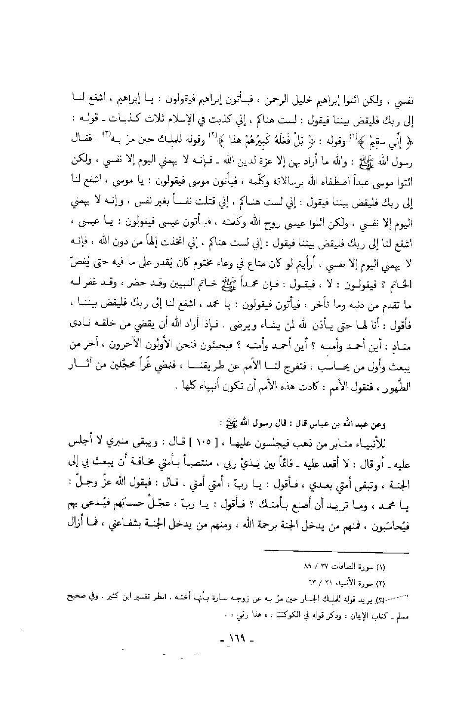 نفسي، ولكن ائتوا نوحاً، فيأتون نوحاً فيقولون: يا نوح، اشفع لنا إلى ربك فيقضي بيننا، فيقول: لست هناكم، إني دعوت دعوة أغرقت أهل الأرض، وإنه لا يهمني اليوم إلا نفسي، ولكن ائتوا إبراهيم خليل الرحمن، فيأتون إبراهيم فيقولون: يا إبراهيم، اشفع لنا إلى ربك فليقض بيننا فيقول: لست هناكم، إني كذبت في الإسلام ثلاث كذبات قوله: " إني سقيم " وقوله: " بل فعله كبيرهم هذا " وقوله للملك حين مر به فقال رسول الله صَلَّى اللهُ عَلَيْهِ وَسَلَّمَ: والله ما أرد بهن إلا عزة لدين الله فإنه لا يهمني اليوم إلا نفسي، ولكن ائتوا موسى عبداً اصطفاه الله برسالته وكلمه، فيأتون موسى فيقولون: يا موسى، اشفع لنا إلى ربك فليقض بيننا فيقول: إني لست هناكم، إني قتلت نفساً بغير نفس، وإنه لا يهمني اليوم إلا نفسي، ولكن ائتوا عيسى روح الله وكلمته، فيأتون عيسى فيقولون: يا عيسى، اشفع لنا إلى ربك فليقض بيننا فيقول: إني لست هناكم، إني اتخذت إلهاً من دون الله، فإنه لا يهمني اليوم إلا نفسي، أرأيتم لو كان متاع في وعاء مختوم كان يقدر على ما فيه حتى يفض الخاتم؟ فيقولون: لا، فيقول: فإن محمداً صَلَّى اللهُ عَلَيْهِ وَسَلَّمَ خاتم النبيين وقد حضر، وقد غفر له ما تقدم من ذنبه وما تأخر، فيأتون فيقولون: يا محمد، اشفع لنا إلى ربك فليقض بيننا، فأقول: أنا لها حتى يأذن الله لمن يشاء ويرضى. فإذا أراد الله أن يقضي من خلقه نادى منادٍ: أين أحمد وأمته؟ أين أحمد وأمته؟ فيجيئون فنحن الأولون الآخرون، آخر من يبعث وأول من يحاسب، فتفرج لنا الأمم عن طريقنا، فنمضي غراً محجلين من آثار الطهور، فتقول الأمم: كادت هذه الأمم أن تكون أنبياء كلها ".