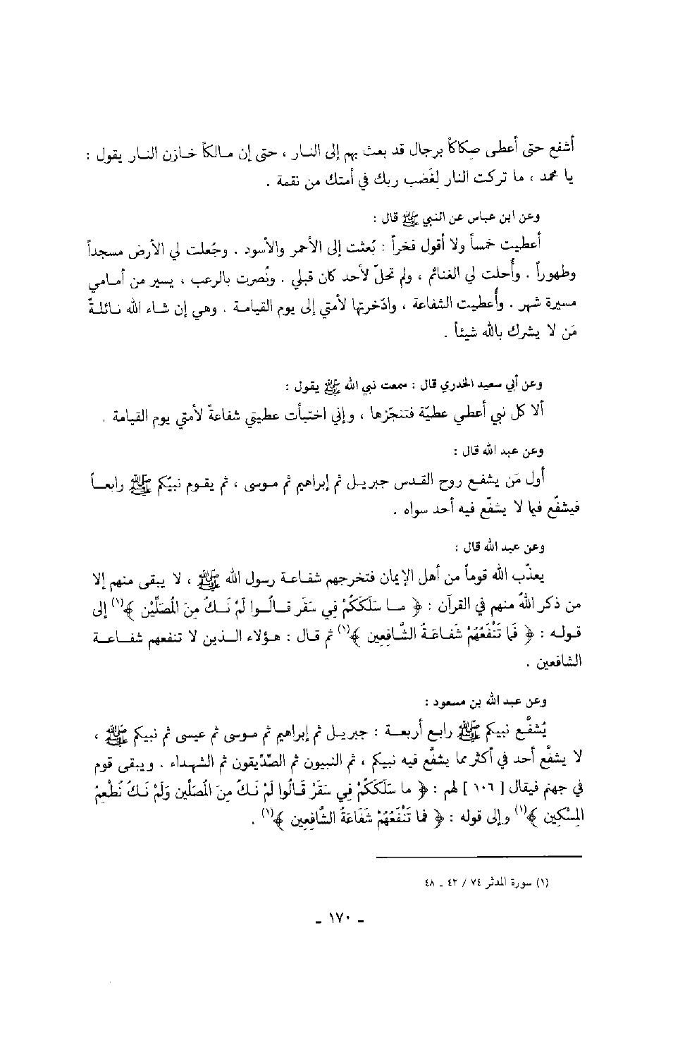 وعن ابن عباس عن النبي صَلَّى اللهُ عَلَيْهِ وَسَلَّمَ قال: " أعطيت خمساً ولا أقول فخراً: بعثت إلى الأحمر والأسود. وجعلت لي الأرض مسجداً وطهوراً. وأحلت لي الغنائم، ولم تحل لأحد كان قبلي. ونصرت بالرعب، يسير من أمامي مسيرة شهر. وأعطيت الشفاعة، وادخرتها لأمتي إلى يوم القيامة. وهي إن شاء الله نائلةٌ من لا يشرك بالله شيئاً ". وعن أبي سعيد الخدري قال: سمعت نبي الله صَلَّى اللهُ عَلَيْهِ وَسَلَّمَ يقول: " ألا كل نبي أعطي عطية فتنجزها، وإني اختبأت عطيتي شفاعةً لأمتي يوم القيامة ". وعن عبد الله قال: أول من يشفع روح القدس جبريل ثم إبراهيم ثم موسى، ثم يقوم نبيكم صَلَّى اللهُ عَلَيْهِ وَسَلَّمَ رابعاً فيشفع فيما لا يشفع فيه أحد سواه. وعن عبد الله قال: يعذب الله قوماً من أهل الإيمان فتخرجهم شفاعة رسول الله صَلَّى اللهُ عَلَيْهِ وَسَلَّمَ، لا يبقى منهم إلا من ذكر الله منهم في القرآن: " ما سلككم في سقر قالوا لم نك من المصلين " إلى قوله: " فما تنفعهم شفاعة الشافعين " ثم قال: هؤلاء الذين لا تنفعهم شفاعة الشافعين. وعن عبد الله بن مسعود: يشفع نبيكم صَلَّى اللهُ عَلَيْهِ وَسَلَّمَ رابع أربعة: جبريل ثم إبراهيم ثم موسى ثم عيسى ثم نبيكم صَلَّى اللهُ عَلَيْهِ وَسَلَّمَ، لا يشفع أحد في أكثر مما يشفع فيه نبيكم، ثم النبيون ثم الصديقون ثم الشهداء. ويبقى قوم في جهنم فيقال لهم: " ما سلككم في سقر قالوا لم نك من المصلين ولم نك نطعم المسكين " وإلى قوله: " فما تنفعهم شفاعة الشافعين ".