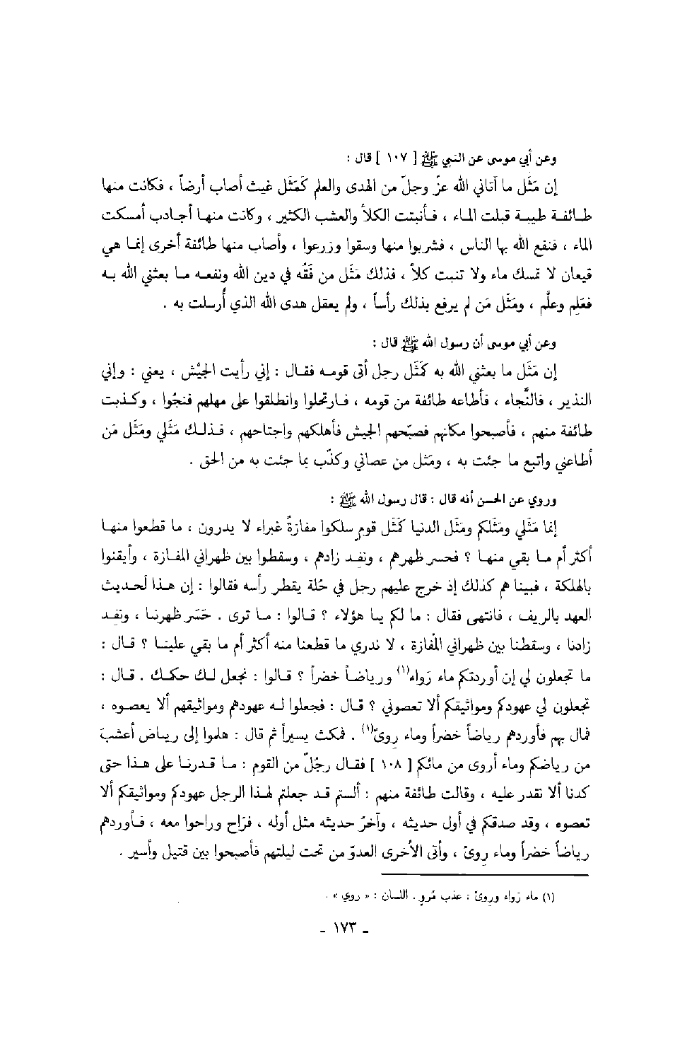 وعن أبي موسى عن النبي صَلَّى اللهُ عَلَيْهِ وَسَلَّمَ قال: " إن مثل ما آتاني الله عز وجل من الهدى والعلم كمثل غيث أصاب أرضاً، فكانت منها طائفة طيبة قبلت الماء، فأنبتت الكلأ والعشب الكثير، وكانت منها أجادب أمسكت الماء، فنفع الله بها الناس، فشربوا منها وسقوا وزرعوا، وأصاب منها طائفة أخرى إنما هي قيعان لا تمسك ماء ولا تنبت كلأ، فذلك مثل من فقه في دين الله ونفعه ما بعثني الله به فعلم وعلم، ومثل من لم يرفع بذلك رأساً، ولم يعقل هدى الله الذي أُرسلت به ". وعن أبي موسى أن رسول الله صَلَّى اللهُ عَلَيْهِ وَسَلَّمَ قال: " إن مثل ما بعثني الله به كمثل رجل أتى قومه فقال: أني رأيت الجيش، يعني: وإني النذير، فالنجاء، فأطاعه طائفة من قومه، فارتحلوا وانطلقوا على مهلهم فنجوا، وكذبت طائفة منهم، فأصبحوا مكانهم فصبّحهم الجيش فأهلكهم واجتاحهم، فذلك مثلي ومثل من أطاعني واتبع ما جئت به، ومثل من عصاني وكذّب بما جئت به من الحق ".