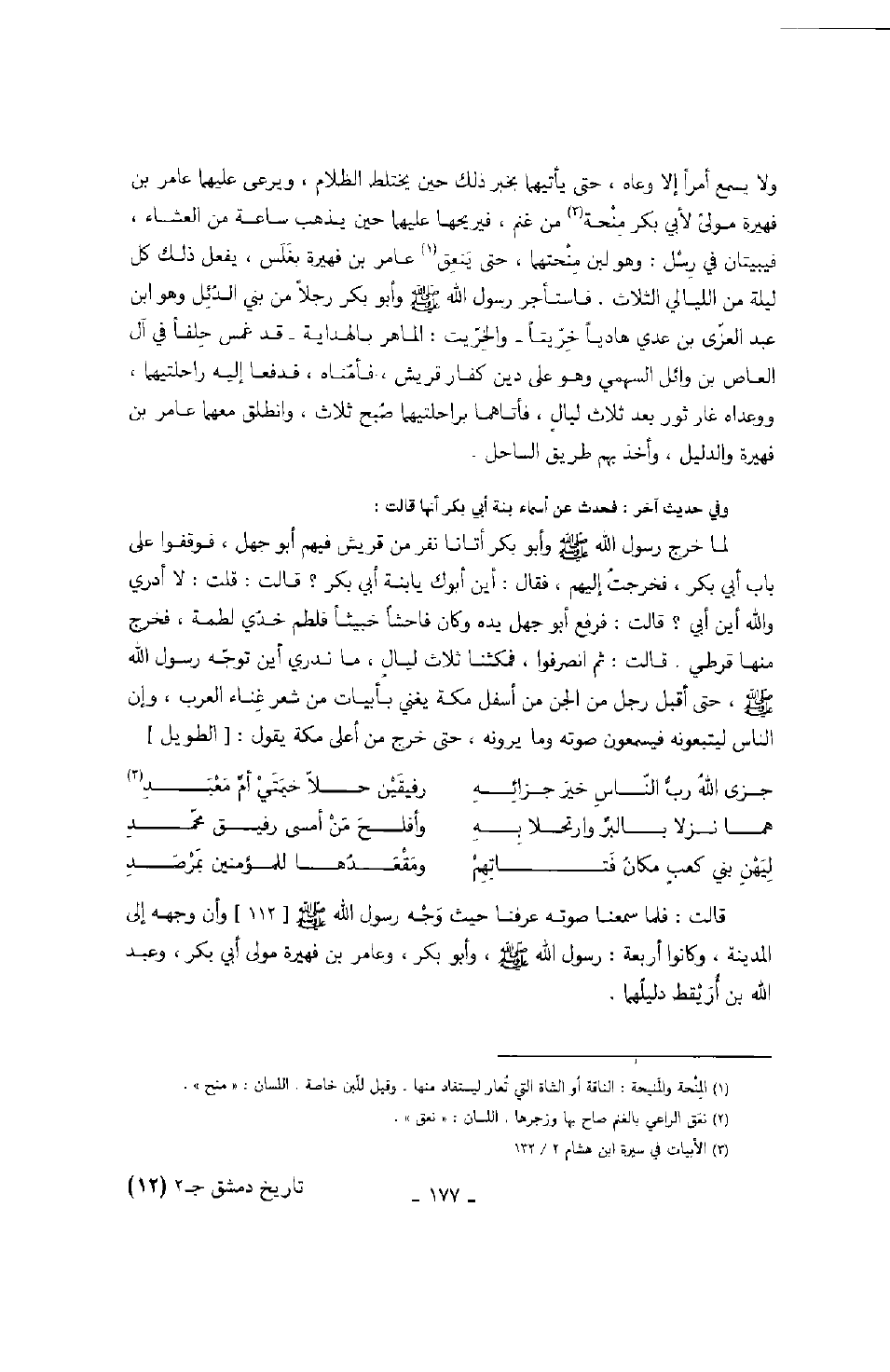 ولا يسمع أمراً إلا وعاه، حتى يأتيهما بخبر ذلك حين يختلط الظلام، ويرعى عليهما عامر بن فهيرة مولىً لأبي بكر منحة من غنم، فيريحها عليهما حين يذهب ساعة من العشاء، فيبيتان في رسل: وهو لبن منحتهما، حتى ينعق عامر بن فهيرة بغلس، يفعل ذلك كل ليلة من الليالي الثلاث. فاستأجر رسول الله صَلَّى اللهُ عَلَيْهِ وَسَلَّمَ وأبو بكر رجلاً من بني الدئل وهو ابن عبد العزى بن عدي هادياً خرّيتاً والخريت: الماهر بالهداية قد غمس حلفاً في آل العاص بن وائل السهمي وهو على دين كفار قريش، فأمناه، فدفعا إليه راحلتيهما، ووعداه غار ثور بعد ثلاث ليالٍ، فأتاهما براحلتيهما صبح ثلاث، وانطلق معهما عامر بن فهيرة والدليل، وأخذ بهم طريق الساحل. وفي حديث آخر: فحدث عن أسماء بنة أبي بكر أنها قالت: لما خرج رسول الله صَلَّى اللهُ عَلَيْهِ وَسَلَّمَ وأبو بكر أتانا نفر من قريش فيهم أبو جهل، فوقفوا على باب أبي بكر، فخرجت إليهم، فقال: أين أبوك يا بنة أبي بكر؟ قالت: قلت: لا أدري والله أين أبي؟ قالت: فرفع أبو جهل يده وكان فاحشاً خبيثاً فلطم خدي لطمة، فخرج منها قرطي. قالت: ثم انصرفوا، فمكثنا ثلاث ليالٍ، ما ندري أين توجه رسول الله صَلَّى اللهُ عَلَيْهِ وَسَلَّمَ، حتى أقبل رجل من الجن من أسفل مكة يغني بأبيات من شعر غناء العرب، وإن الناس ليتبعونه فيسمعون صوته وما يرونه، حتى خرج من أعلى مكة يقول: الطويل