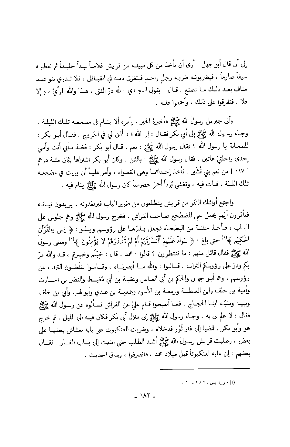 إلى أن قال أبو جهل: أرى أن نأخذ من كل قبيلة من قريش غلاماً نهداً جليداً ثم نعطيه سيفاً صارماً، فيضربونه ضربة رجلٍ واحدٍ فيتفرق دمه في القبائل، فلا تدري بنو عبد مناف بعد ذلك ما تصنع. قال: يقول النجدي: لله در الفتى، هذا والله الرأي، وإلا فلا. فتفرقوا على ذلك، وأجمعوا عليه. وأتى جبريل رسول الله صَلَّى اللهُ عَلَيْهِ وَسَلَّمَ فأخبره الخبر، وأمره ألا ينام في مضجعه تلك الليلة. وجاء رسول الله صَلَّى اللهُ عَلَيْهِ وَسَلَّمَ إلى أبي بكر فقال: إن الله قد أذن لي في الخروج. فقال أبو بكر: للصحابة يا رسول الله؟ فقال رسول الله صَلَّى اللهُ عَلَيْهِ وَسَلَّمَ: نعم، قال أبو بكر: فخذ بأبي أنت وأمي إحدى راحلتي هاتين. فقال رسول الله صَلَّى اللهُ عَلَيْهِ وَسَلَّمَ: بالثمن. وكان أبو بكر اشتراهما بثمان مئة درهم من نعم بني قشير. فأخذ إحداهما وهي القصواء، وأمر علياً أن يبيت في مضجعه تلك الليلة، فبات فيه، وتغشى برداً أحمر حضرمياً كان رسول الله صَلَّى اللهُ عَلَيْهِ وَسَلَّمَ ينام فيه. واجتمع أولئك النفر من قريش يتطلعون من صبير الباب فيرصدونه، يريدون بياته فيأتمرون أيهم يحمل على المضطجع صاحب الفراش. فخرج رسول الله صَلَّى اللهُ عَلَيْهِ وَسَلَّمَ وهم جلوس على الباب، فأخذ حفنة من البطحاء فجعل يذرها على روؤسهم ويتلو: " يس والقرآن الحكيم " حتى بلغ: " سواءٌ عليهم أأنذرتهم أم لم تنذرهم لا يؤمنون " ومضى رسول الله صَلَّى اللهُ عَلَيْهِ وَسَلَّمَ فقال قائل منهم: ما تنظرون؟ قالوا: محمد. قال: خبتم وخسرتم، قد والله مر بكم وذر على رؤوسكم التراب. قالوا: والله ما أبصرناه، وقاموا ينفضون التراب عن رؤوسهم، وهم أبو جهل والحكم بن أبي العاص وعقبة بن أبي معيط والنضر بن الحارث وأمية بن خلف وابن العيطلة وزمعة بن الأسود وطعيمة ين عدي وأبو لهب وأبيّ بن خلف ونبيه ومنبّه ابنا الحجاج. فلما أصبحوا قام عليّ عن الفراش فسألوه عن رسول الله صَلَّى اللهُ عَلَيْهِ وَسَلَّمَ فقال: لا علم لي به. وجاء رسول الله صَلَّى اللهُ عَلَيْهِ وَسَلَّمَ إلى منزل أبي بكر فكان فيه إلى الليل. ثم خرج هو وأبو بكر. فمضيا إلى غار ثور فدخلاه، وضربت العنكبوت على بابه بعشاش بعضها على بعض، وطلبت قريش رسول الله صَلَّى اللهُ عَلَيْهِ وَسَلَّمَ أشد الطلب حتى انتهت إلى باب الغار. فقال بعضهم: إن عليه لعنكبوتاً قبل ميلاد محمد، فانصرفوا، وساق الحديث.