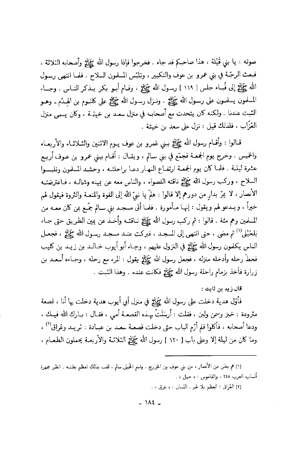 ونزل رسول الله صَلَّى اللهُ عَلَيْهِ وَسَلَّمَ على كلثوم بن الهدم وهو الثبت عندنا ولكنه كان يتحدث مع أصحابه في منزل سعد بن خيثمة، وكان يسمى منزل العزّاب، فلذلك قيل نزل على سعد بن خيثمة. قالوا: وأقام رسول الله صَلَّى اللهُ عَلَيْهِ وَسَلَّمَ ببني عمرو بن عوف يوم الاثنين والثلاثاء والأربعاء والخميس. وخرج يوم الجمعة فجمّع في بني سالم، ويقال: أقام ببني عمرو بن عوف أربع عشرة ليلة. فلما كان يوم الجمعة ارتفاع النهار دعا براحلته، وحشد المسلمون وتلبسوا السلاح، وركب رسول الله صَلَّى اللهُ عَلَيْهِ وَسَلَّمَ ناقته القصواء، والناس معه عن يمينه وشماله، فاعترضته الأنصار، لا يمر بدارٍ من دورهم إلا قالوا: هلمّ يا نبي الله إلى القوة والمنعة والثروة فيقول لهم خيراً، ويدعو لهم ويقول: إنها مأمورة. فلما أتى مسجد بني سالم جمّع بمن كان معه من المسلمين وهم مئة. قالوا: ثم ركب رسول الله صَلَّى اللهُ عَلَيْهِ وَسَلَّمَ ناقته وأخذ عن يمين الطريق حتى جاء بلحبلى ثم مضى، حتى انتهى إلى المسجد، فبركت عند مسجد رسول الله صَلَّى اللهُ عَلَيْهِ وَسَلَّمَ، فجعل الناس يكلمون رسول الله صَلَّى اللهُ عَلَيْهِ وَسَلَّمَ في النزول عليهم، وجاء أبو أيوب خالد بن زيد بن كليب فحط رحله وأدخله منزله، فجعل رسول الله صَلَّى اللهُ عَلَيْهِ وَسَلَّمَ يقول: المرء مع رحله، وجاءه أسعد بن زرارة فأخذ بزمام راحلة رسول الله صَلَّى اللهُ عَلَيْهِ وَسَلَّمَ فكانت عنده. وهذا الثبت.