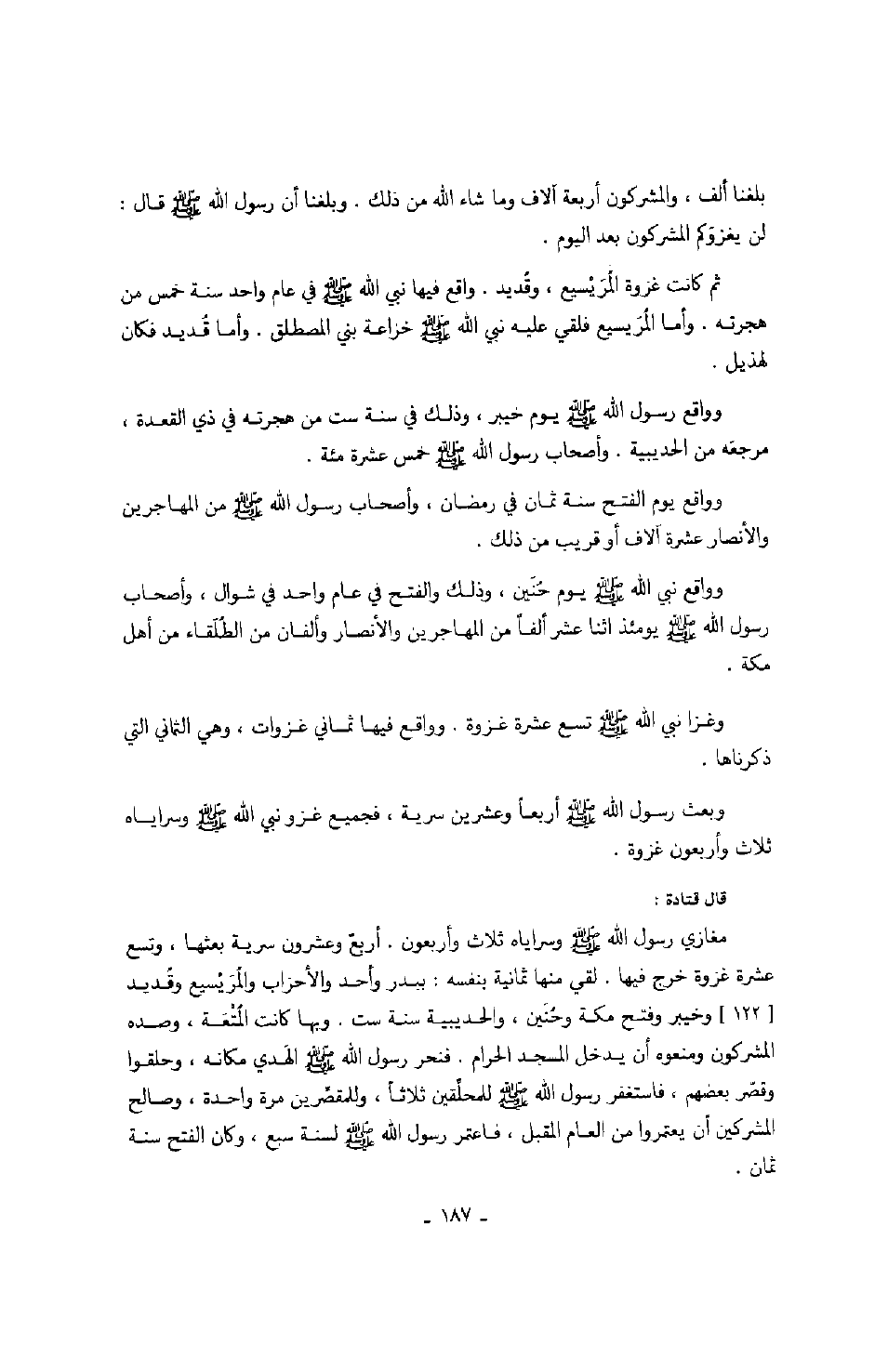 بلغنا ألف، والمشركون أربعة آلاف وما شاء الله من ذلك. وبلغنا أن رسول الله صَلَّى اللهُ عَلَيْهِ وَسَلَّمَ قال: " لن يغزوكم المشركون بعد اليوم ". ثم كانت غزوة المريسيع، وقديد. واقع فيها نبي الله صَلَّى اللهُ عَلَيْهِ وَسَلَّمَ في عام واحد سنة خمس من هجرته. وأما المريسيع فلقي عليه نبي الله صَلَّى اللهُ عَلَيْهِ وَسَلَّمَ خزاعة بني المصطلق. وأما قديد فكان لهذيل. وواقع رسول الله صَلَّى اللهُ عَلَيْهِ وَسَلَّمَ يوم خيبر، وذلك في سنة ست من هجرته في ذي القعدة، مرجعه من الحديبية. وأصحاب رسول الله صَلَّى اللهُ عَلَيْهِ وَسَلَّمَ خمس عشرة مئة. وواقع يوم الفتح سنة ثمان في رمضان، وأصحاب رسول الله صَلَّى اللهُ عَلَيْهِ وَسَلَّمَ من المهاجرين والأنصار عشرة آلاف أو قريب من ذلك. وواقع نبي الله صَلَّى اللهُ عَلَيْهِ وَسَلَّمَ يوم حنين، وذلك والفتح في عام واحد في شوال، وأصحاب رسول الله صَلَّى اللهُ عَلَيْهِ وَسَلَّمَ يومئذ اثنا عشر ألفاً من المهاجرين والأنصار وألفان من الطلقاء من أهل مكة. وغزا نبي الله صَلَّى اللهُ عَلَيْهِ وَسَلَّمَ تسع عشرة غزوة. وواقع فيها ثماني غزوات، وهي الثمان التي ذكرناها. وبعث رسول الله صَلَّى اللهُ عَلَيْهِ وَسَلَّمَ أربعاً وعشرين سرية، فجميع غزو نبي الله صَلَّى اللهُ عَلَيْهِ وَسَلَّمَ وسراياه ثلاث وأربعون غزوة. قال قتادة: مغازي رسول الله صَلَّى اللهُ عَلَيْهِ وَسَلَّمَ وسراياه ثلاث وأربعون. أربعٌ وعشرون سرية بعثها، وتسع عشرة غزوة خرج فيها. لقي منها ثمانية بنفسه: ببدر والأحزاب والمريسيع وقديد وخيبر وفتح مكة وحنين، والحديبية سنة ست. وبها كانت المتعة، وصده المشركون ومنعوه أن يدخل المسجد الحرام. فنحر رسول الله صَلَّى اللهُ عَلَيْهِ وَسَلَّمَ الهدي مكانه، وحلقوا وقصر بعضهم، فاستغفر رسول الله صَلَّى اللهُ عَلَيْهِ وَسَلَّمَ للمحلقين ثلاثاً، وللمقصرين مرة واحدة، وصالح المشركين أن يعتمروا من العام المقبل، فاعتمر رسول الله صَلَّى اللهُ عَلَيْهِ وَسَلَّمَ لسنة سبع، وكان الفتح سنة ثمان.