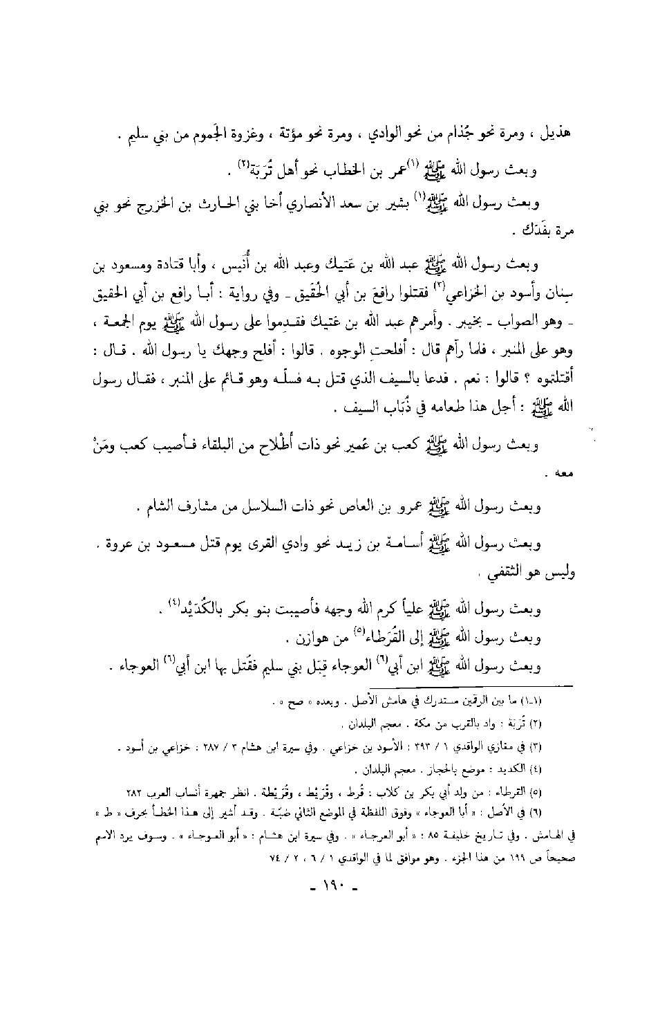 وبعث رسول الله صَلَّى اللهُ عَلَيْهِ وَسَلَّمَ بشير بن سعد الأنصاري أخا بني الحارث بن الخزرج نحو بني مرة بفدك. وبعث رسول الله صَلَّى اللهُ عَلَيْهِ وَسَلَّمَ عبد الله بن أنيس، وأبا قتادة ومسعود بن سنان وأسود بن الخزاعي فقتلوا رافع بن أبي الحَقيق وفي رواية: أبا رافع بن أبي الحقيق وهو الصواب بخيبر. وأمرهم عبد الله بن عتيك فقدموا على رسول الله صَلَّى اللهُ عَلَيْهِ وَسَلَّمَ يوم الجمعة، وهو على المنبر، فلما رآهم قال: أفلحت الوجوه. قالوا: أفلح وجهك يا رسول الله. قال: أقتلتموه؟ قالوا: نعم. فدعا بالسيف الذي قتل به فسله وهو قائم على المنبر، فقال رسول الله صَلَّى اللهُ عَلَيْهِ وَسَلَّمَ: أجل هذا طعامه في ذباب السيف. وبعث رسول الله صَلَّى اللهُ عَلَيْهِ وَسَلَّمَ كعب بن عُمير نحو ذات أطلاح من البلقاء فأصيب كعب ومن معه. وبعث رسول الله صَلَّى اللهُ عَلَيْهِ وَسَلَّمَ عمرو بن العاص نحو السلال من مشارف الشام. وبعث رسول الله صَلَّى اللهُ عَلَيْهِ وَسَلَّمَ أسامة بن زيد نحو وادي القرى يوم قتل مسعود بن عروة. وليس هو الثقفي. وبعث رسول الله صَلَّى اللهُ عَلَيْهِ وَسَلَّمَ علياً كرم الله وجهه فأصيب بنو بكر بالكديد. وبعث رسول الله صَلَّى اللهُ عَلَيْهِ وَسَلَّمَ إلى القرطاء من هوزان. وبعث رسول الله صَلَّى اللهُ عَلَيْهِ وَسَلَّمَ ابن أبي العوجاء قبل بني سليم فقتل بها ابن أبي العوجاء.