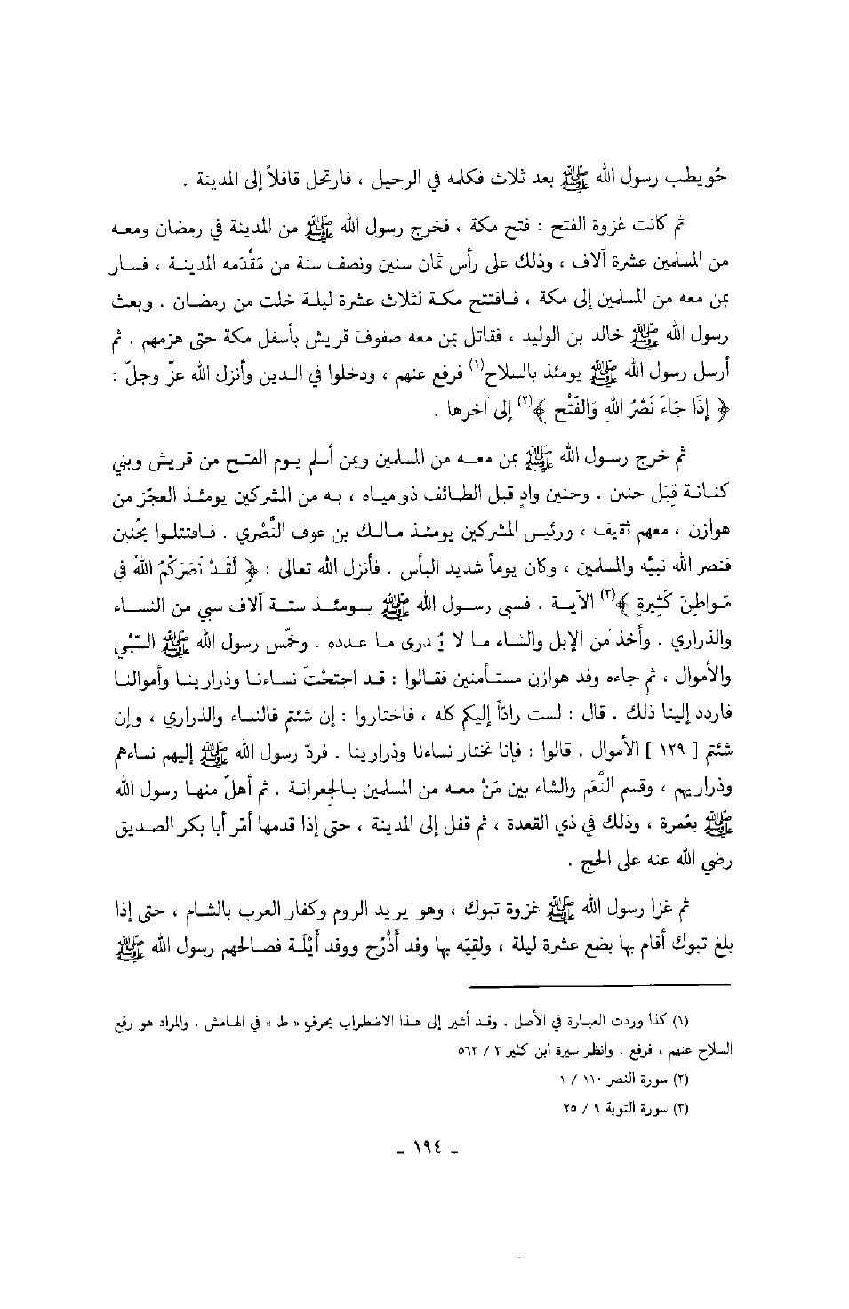 حويطب رسول الله صَلَّى اللهُ عَلَيْهِ وَسَلَّمَ بعد ثلاث فكلمه في الرحيل، فارتحل قافلاً إلى المدينة. ثم كانت غزوة الفتح: فتح مكة، فخرج رسول الله صَلَّى اللهُ عَلَيْهِ وَسَلَّمَ من المدينة في رمضان ومعه من المسلمين عشرة آلاف، وذلك على رأس ثمان سنين ونصف سنة من مقدمه المدينة، فسار بمن معه من المسلمين إلى مكة، فافتتح مكة لثلاث عشرة خلت من رمضان. وبعث رسول الله صَلَّى اللهُ عَلَيْهِ وَسَلَّمَ خالد بن الوليد، فقاتل بمن معه صفوف قريش بأسفل مكة حتى هزمهم. ثم أرسل رسول الله صَلَّى اللهُ عَلَيْهِ وَسَلَّمَ يومئذ بالسلاح فرفع عنهم، ودخلوا في الدين وأنزل الله عز وجل: " إذا جاء نصر الله والفتح " إلى آخرها. ثم خرج رسول الله صَلَّى اللهُ عَلَيْهِ وَسَلَّمَ بمن معه من المسلمين وبمن أسلم يوم الفتح من قريش وبني كنانة قِبَل حنين. وحنين وادٍ قبل الطائف ذو مياه، به من المشركين يومئذ العجّز من هوازن، معهم ثقيف، ورئيس المشركين يومئذ مالك بن عوف النصري. فاقتتلوا بحنين فنصر الله نبيه والمسلمين، وكان يوماً شديد البأس. فأنزل الله تعالى: " لقد نصركم الله في مواطن كثيرةٍ " الآية. فسبى رسول الله صَلَّى اللهُ عَلَيْهِ وَسَلَّمَ يومئذ ستة آلاف سبي من النساء والذراري. وأخذ من الإبل والشاء ما لا يُدرى ما عدده. وخمّس رسول الله صَلَّى اللهُ عَلَيْهِ وَسَلَّمَ السبي والأموال، ثم جاءه وفد هوازن مستأمنين فقالوا: قد اجتحت نساءنا وذرارينا وأموالنا فاردد إلينا ذلك. قال: لست رادّاً إليكم كله، فاختاروا: إن شئتم فالنساء والذراري، وإن شئتم الأموال. قالوا: فإنا نختار نساءنا وذرارينا. فرد رسول الله صَلَّى اللهُ عَلَيْهِ وَسَلَّمَ إليهم نساءهم وذراريهم، وقسم النعم والشاء بين من معه من المسلمين بالجعرانة. ثم أهلّ منها رسول الله صَلَّى اللهُ عَلَيْهِ وَسَلَّمَ بعمرة، وذلك في ذي القعدة، ثم قفل إلى المدينة، حتى إذا قدمها أمر أبا بكر الصديق رضي الله عنه على الحج. ثم غزا رسول الله صَلَّى اللهُ عَلَيْهِ وَسَلَّمَ غزوة تبوك، وهو يريد الروم وكفار العرب بالشام، حتى إذا بلغ تبوك أقام بها بضع عشرة ليلة، ولقيه وفد أذرح ووفد أيلة فصالحهم رسول الله صَلَّى اللهُ عَلَيْهِ وَسَلَّمَ