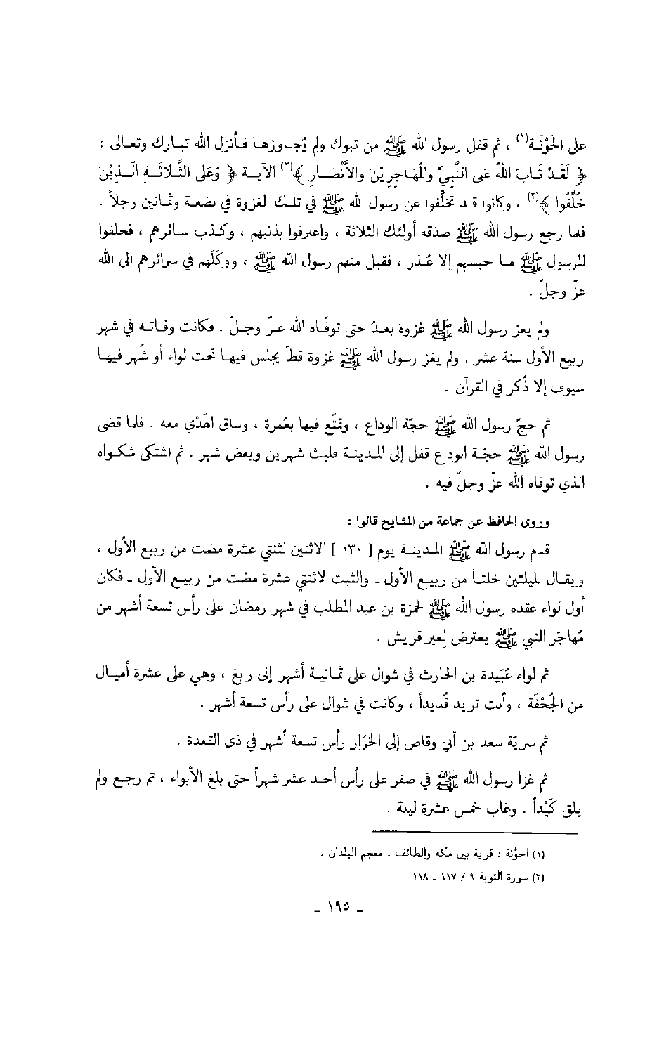 على الجونة، ثم قفل رسول الله صَلَّى اللهُ عَلَيْهِ وَسَلَّمَ من تبوك ولك يجاوزها فأنزل الله تبارك تعالى: " لقد تاب الله على النبي والمهاجرين والأنصار " الآية " وعلى الثلاثة الذين خلفوا "، وكانوا قد تخلفوا عن رسول الله صَلَّى اللهُ عَلَيْهِ وَسَلَّمَ في تلك الغزوة في بضعة وثمانين رجلاً. فلما رجع رسول الله صَلَّى اللهُ عَلَيْهِ وَسَلَّمَ صدقه أولئك الثلاثة، واعترفوا بذنبهم، وكذب سائرهم، فحلفوا للرسول ما حبسهم إلا عذر، فقيل منهم رسول الله صَلَّى اللهُ عَلَيْهِ وَسَلَّمَ، ووكلهم في سرائرهم إلى الله عز وجل.