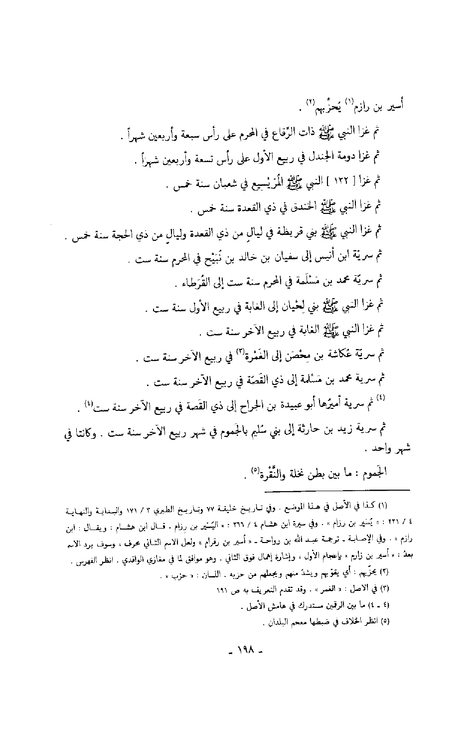 أسير بن رزام يحزبهم. ثم غزا النبي صَلَّى اللهُ عَلَيْهِ وَسَلَّمَ ذات الرقاع في المحرم على رأس سبعة وأربعين شهراً. ثم غزا دومة الجندل في ربيع الأول على رأس تسعة وأربعين شهراً. ثم غزا النبي صَلَّى اللهُ عَلَيْهِ وَسَلَّمَ المريسيع في شعبان سنة خمس. ثم غزا النبي صَلَّى اللهُ عَلَيْهِ وَسَلَّمَ الخندق في ذي القعدة سنة خمس. ثم غزا النبي صَلَّى اللهُ عَلَيْهِ وَسَلَّمَ بني قريظة في ليالٍ من ذي القعدة وليالٍ من ذي الحجة سنة خمس. ثم سرية ابن أنيس إلى سفيان بن خالد بن نبيح في المحرم سنة ست. ثم سرية محمد بن مسلمة في المحرم سنة ست إلى القرطاء. ثم غزا النبي صَلَّى اللهُ عَلَيْهِ وَسَلَّمَ بني لحيان إلى الغابة في ربيع الأول سنة ست. ثم غزا النبي صَلَّى اللهُ عَلَيْهِ وَسَلَّمَ الغابة في ربيع الآخر سنة ست. ثم سرية عكاشة بن محصن إلى الغمرة في ربيع الآخر سنة ست. ثم سرية محمد بن مسلمة إلى ذي القصة في ربيع الآخر سنة ست. ثم سرية أميرها أبو عبيدة الجراح إلى ذي القصة في ربيع الآخر سنة ست. ثم سرية زيد بن حارثة إلى بني سليم بالجموم في شهر ربيع الآخر سنة ست. وكانتا في شهر واحد. الجموم: ما بين بطن نخلة والنقرة.