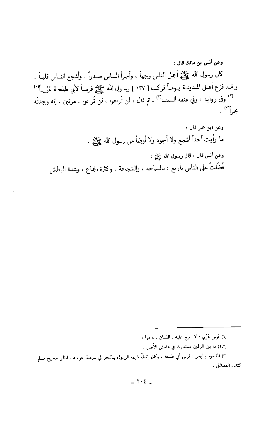 وعن أنس بن مالك قال: كان رسول الله صَلَّى اللهُ عَلَيْهِ وَسَلَّمَ أجمل الناس وجهاً، وأجرأ الناس صدراً، وأشجع الناس قلباً. ولقد فرغ أهل المدينة يوماً فركب رسول الله صَلَّى اللهُ عَلَيْهِ وَسَلَّمَ فرساً لأبي طلحة عرياً وفي رواية: وفي عنقه السيف ثم قال: لن تراعوا، لن ترعوا. مرتين. إنه وجدته بحراً. وعن ابن عمر قال: ما رأيت أحداً أشجع ولا أجود ولا أوضأ من رسول الله صَلَّى اللهُ عَلَيْهِ وَسَلَّمَ. وعن أنس قال: قال رسول الله صَلَّى اللهُ عَلَيْهِ وَسَلَّمَ: " فضلت على الناس بأربع: بالسماحة، والشجاعة، وكثرة الجماع، وشدة البطش ".