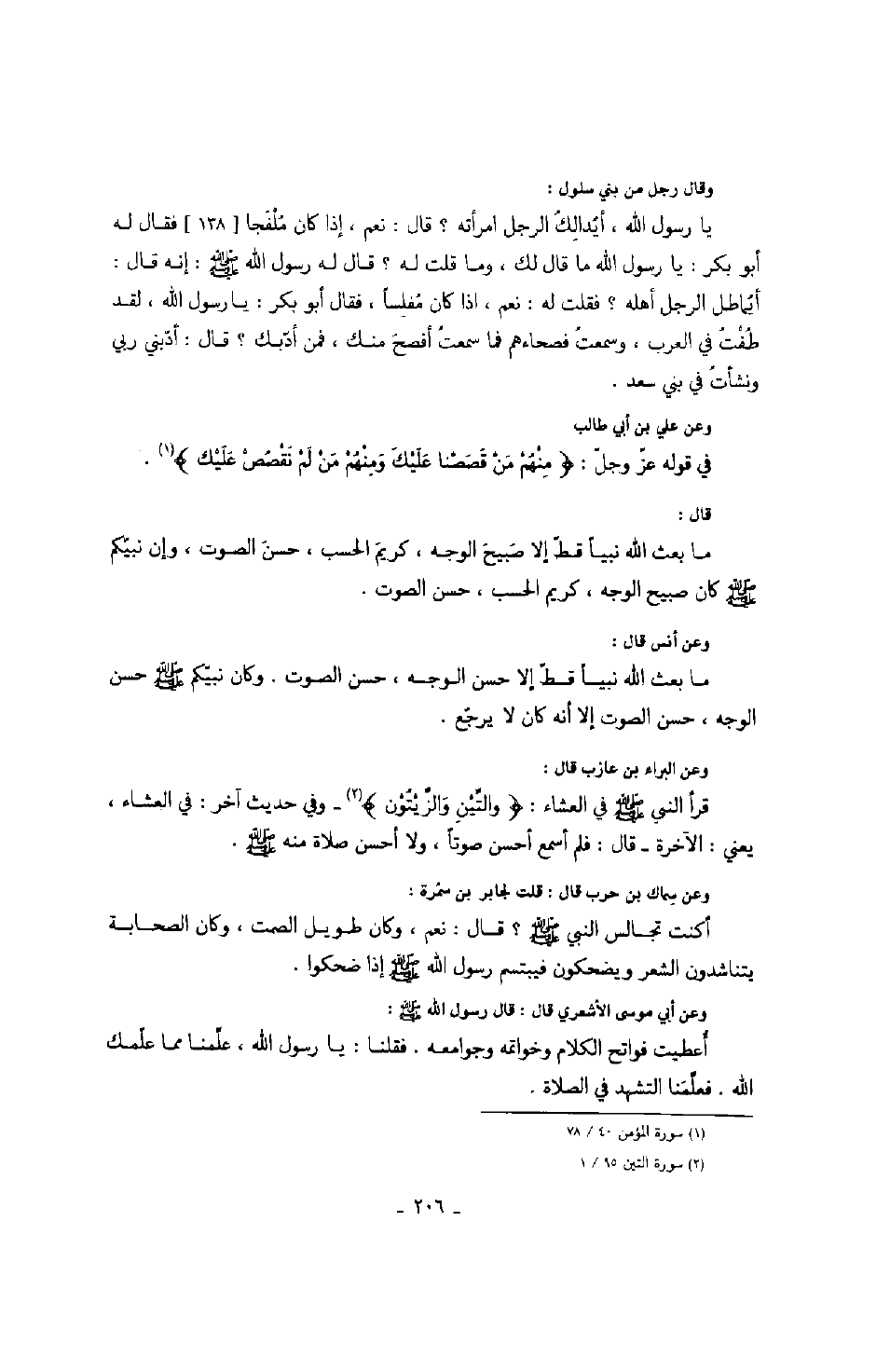 وعن علي بن أبي طالب: في قوله عز وجل: " منهم من قصصنا عليك ومنهم من لم نقصص عليك ". قال: ما بعث الله نبياً قط إلا صبيح الوجه، كريم الحسب، حسن الصوت، وإن نبيكم صَلَّى اللهُ عَلَيْهِ وَسَلَّمَ كان صبيح الوجه، كريم الحسب، حسن الصوت. وعن أنس قال: ما بعث الله نبياً قط إلا حسن الوجه، حسن الصوت، وكان نبيكم حسن الوجه، حسن الصوت إلا أنه كان لا يرجّع. وعن البراء بن عازب قال: قرأ النبي صَلَّى اللهُ عَلَيْهِ وَسَلَّمَ في العشاء: " والتين والزيتون " وفي حديث آخر: في العشاء، يعني: الآخرة قال: فلم أسمع أحسن صوتاً، ولا أحسن صلاة منه صَلَّى اللهُ عَلَيْهِ وَسَلَّمَ. وعن سماك بن حرب قال: قلت لجابر بن سمرة: أكنت تجالس النبي صَلَّى اللهُ عَلَيْهِ وَسَلَّمَ؟ قال: نعم، وكان طويل الصمت، وكان الصحابة يتناشدون الشعر ويضحكون فيبتسم رسول الله صَلَّى اللهُ عَلَيْهِ وَسَلَّمَ إذا ضحكوا. وعن أبي موسى الأشعري قال: قال رسول الله صَلَّى اللهُ عَلَيْهِ وَسَلَّمَ: " أعطيت فواتح الكلام وخواتمه وجوامعه ". فقلنا: يا رسول الله، علمنا مما علمك الله. فعلمنا التشهد في الصلاة ".