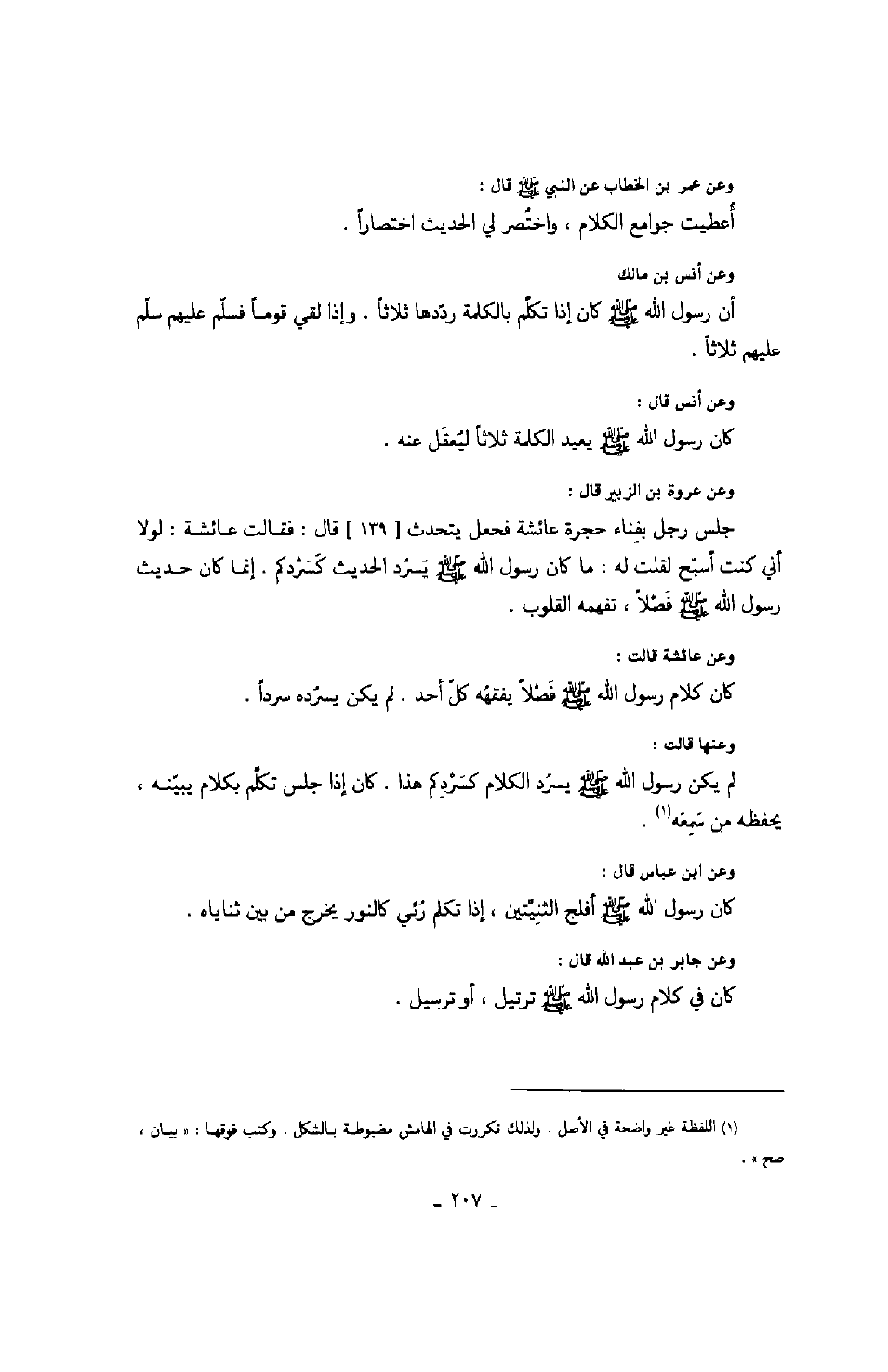 وعن عمر بن الخطاب عن النبي صَلَّى اللهُ عَلَيْهِ وَسَلَّمَ قال: " أعطيت جوامع الكلام، واختُصر لي الحديث اختصاراً ". وعن أنس بن مالك: أن رسول الله صَلَّى اللهُ عَلَيْهِ وَسَلَّمَ كان إذا تكلم بالكلمة رددها ثلاثاً. وإذا لقي قوماً فسلم عليهم سلم عليهم ثلاثاً. وعن أنس قال: كان رسول الله صَلَّى اللهُ عَلَيْهِ وَسَلَّمَ يعيد الكلمة ثلاثاً ليُعقل عنه. وعن عروة بن الزبير قال: جلس رجل بفناء حجرة عائشة فجعل يتحدث قال: فقالت عائشة: لولا إني كنت أسبح لقلت له: ما كان رسول الله صَلَّى اللهُ عَلَيْهِ وَسَلَّمَ يسرد الحديث كسردكم. إنما كان حديث رسول الله صَلَّى اللهُ عَلَيْهِ وَسَلَّمَ فصلاً، تفهمه القلوب. وعن عائشة قالت: كان كلام رسول الله صَلَّى اللهُ عَلَيْهِ وَسَلَّمَ فصلاً يفقهه كل أحد. لم يكن يسرده سرداً. وعنها قالت: لم يكن رسول الله صَلَّى اللهُ عَلَيْهِ وَسَلَّمَ يسرد الكلام كسردكم هذا. كان إذا جلس تكلم بكلام يبينه، يحفظه من سمعه.
