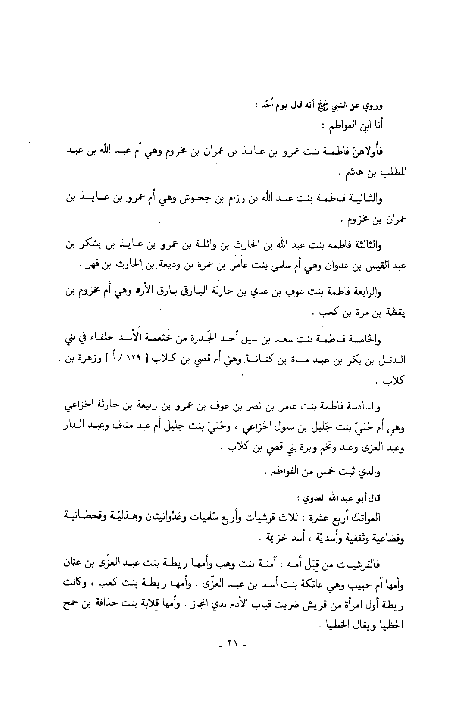 وروي عن النبي صَلَّى اللهُ عَلَيْهِ وَسَلَّمَ أنه قال يوم أحد: أنا ابن الفواطم: فأولاهن فاطمة بنت عمرو بن عايذ بن عمران بن مخزوم وهي أم عبيد الله بن عبد المطلب بن هاشم.