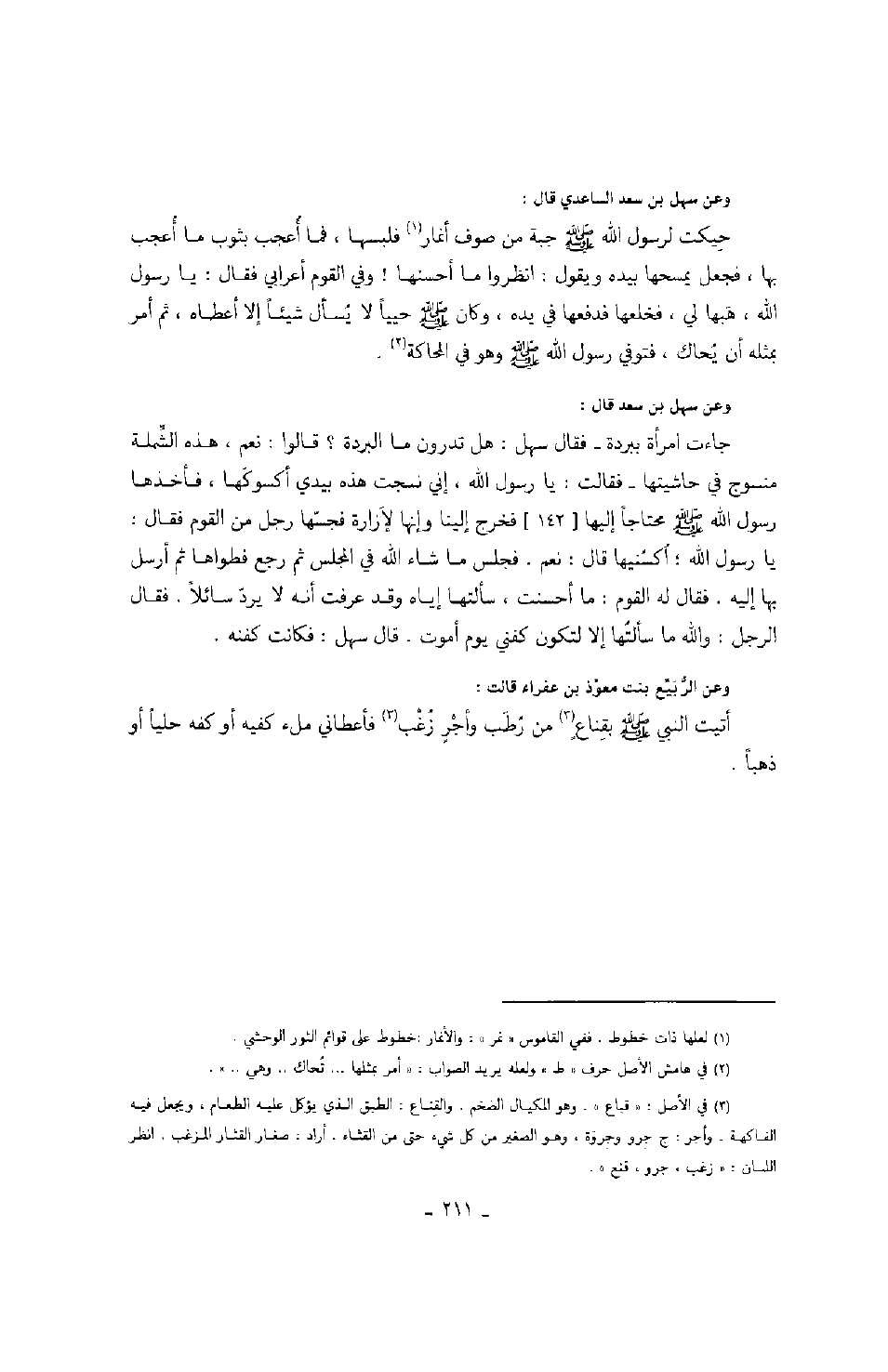 وعن سهل بن سعد الساعدي قال: حيكت لرسول الله صَلَّى اللهُ عَلَيْهِ وَسَلَّمَ جبة من صوف أنمار فلبسها، فما أُعجب بثوب ما أُعجب بها، فجعل يمسحها بيده ويقول: انظروا ما أحسنها! وفي القوم أعرابي فقال: يا رسول الله، هبها لي، فخلعها فدفعها في يده، وكان صَلَّى اللهُ عَلَيْهِ وَسَلَّمَ حيياً لا يُسأل شيئاً إلا أعطاه، ثم أمر بمثله أن يحاك، فتوفي رسول الله صَلَّى اللهُ عَلَيْهِ وَسَلَّمَ وهو في المحاكة. وعن سهل بن سعد قال: جاءت امرأة ببردة فقال سهل: هل تدرون ما البردة؟ قالوا: نعم، هذه الشملة منسوج في حاشيتها فقالت: يا رسول الله، إني نسجت هذه بيدي أكسوكها، فأخذها رسول الله صَلَّى اللهُ عَلَيْهِ وَسَلَّمَ محتاجاً إليها فخرج إلينا وإنها لإزارة فجسها رجل من القوم فقال: يا رسول الله؛ أكسنيها قال: نعم. فجلس ما شاء الله في المجلس ثم رجع فطواها ثم أرسل بها إليه. فقال له القوم: ما أحسنت، سألتها إياه وقد عرفت أنه لا يرد سائلاً. فقال الرجل: والله ما سألتها إلا لتكون كفني يوم أموت. قال سهل: فكانت كفنه. وعن الربيع بنت معوذ بن عفراء قالت: أتيت النبي صَلَّى اللهُ عَلَيْهِ وَسَلَّمَ بقناعٍ من رطب وأجرٍ زُغب فأعطاني ملء كفيه أو كفه حلياً أو ذهباً.